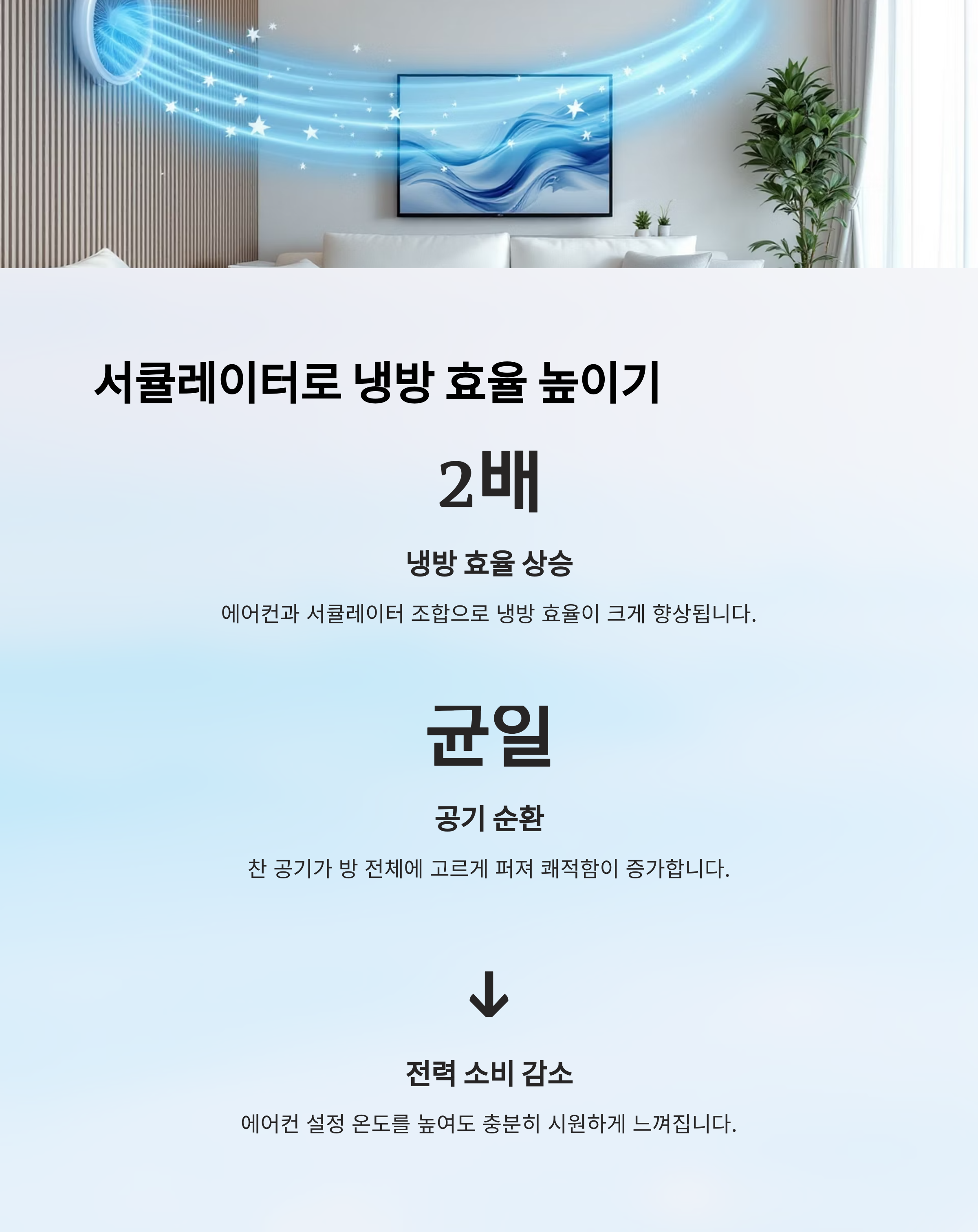 에어컨만 단독으로 사용하는 것보다 서큘레이터를 함께 쓰면 냉방 효율이 확 올라가요. 에어컨의 찬 공기는 아래로, 더운 공기는 위로 모이기 때문에 공기 순환이 제대로 안 되면 시원함이 고르게 퍼지지 않거든요.