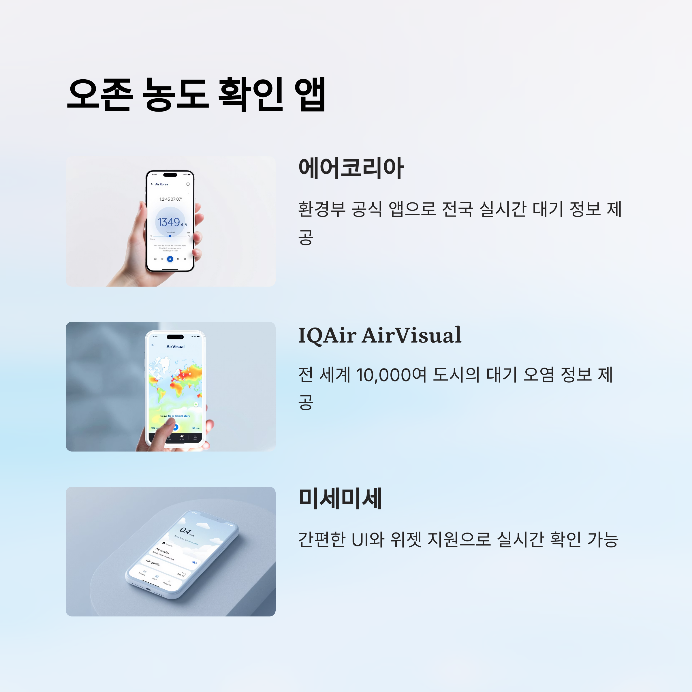 이 앱들 중 하나만 설치해두면 오존 농도 높은 날도 당황하지 않고 대처할 수 있어요. 내 건강은 내가 지키는 거니까, 스마트하게 활용해보세요! 🧠📲