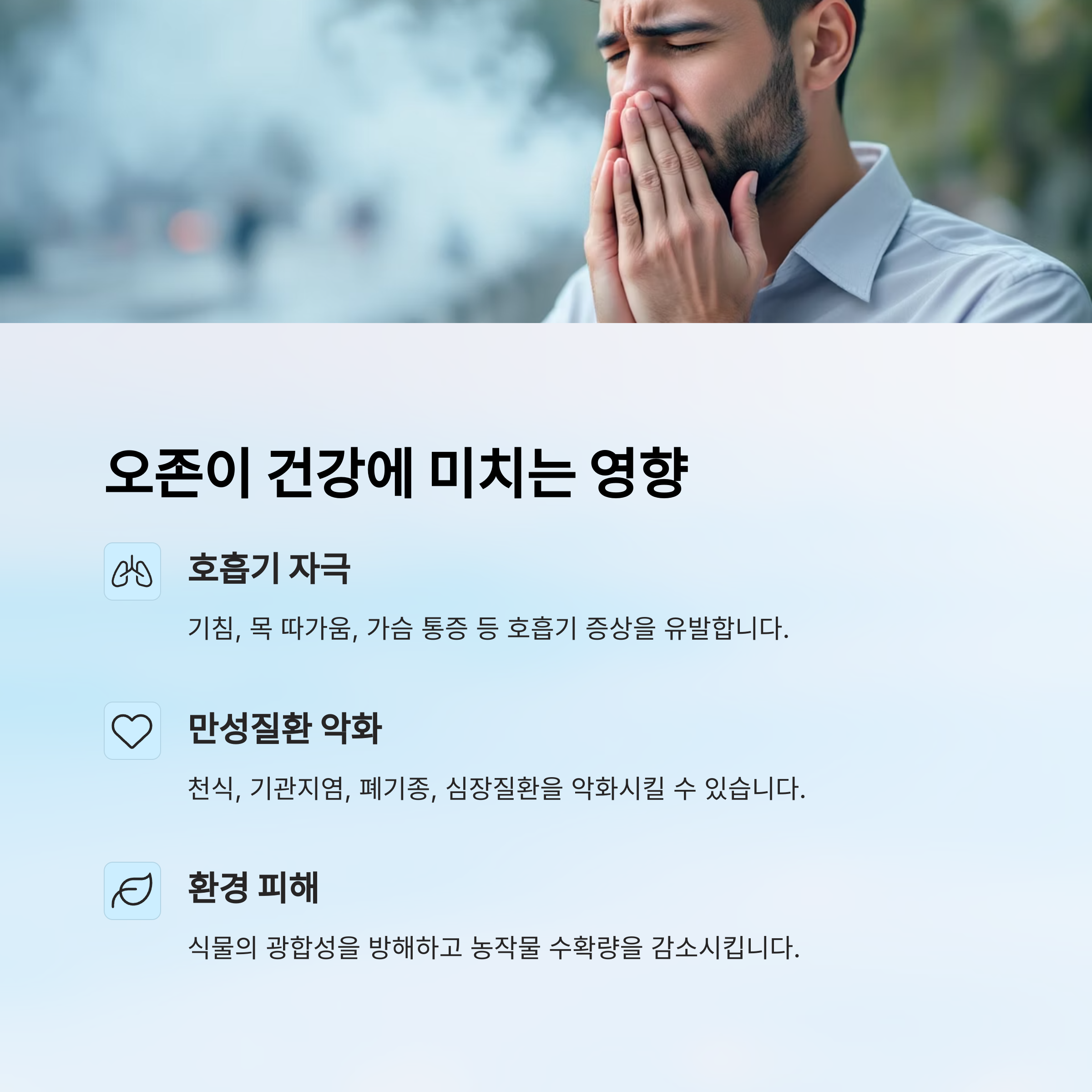 심한 경우 오존에 장시간 노출되면 천식, 기관지염, 폐기종, 심장질환 같은 만성 질환이 악화될 수 있어요. 특히 어린이, 노인, 임산부, 호흡기·심장 질환자 등은 더욱 취약해서 더 큰 영향을 받을 수 있어요. 오존은 눈과 피부에도 자극을 주며, 안구 건조증과 충혈도 일으킬 수 있어요.