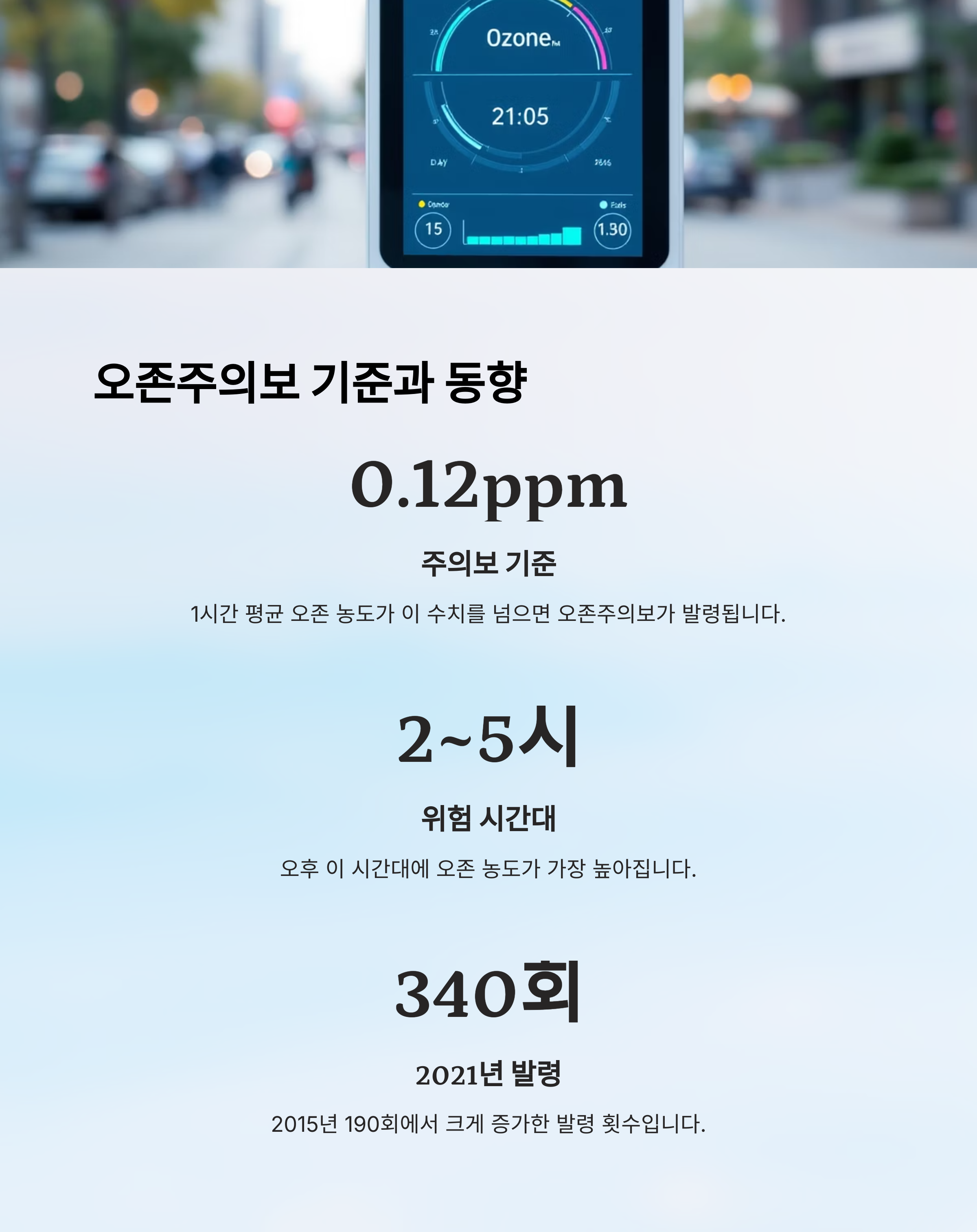A1. 1시간 평균 오존 농도가 0.12ppm을 초과할 경우 오존주의보가 발령돼요. 주로 5월~9월 사이, 오후 2시~5시에 자주 발생해요.