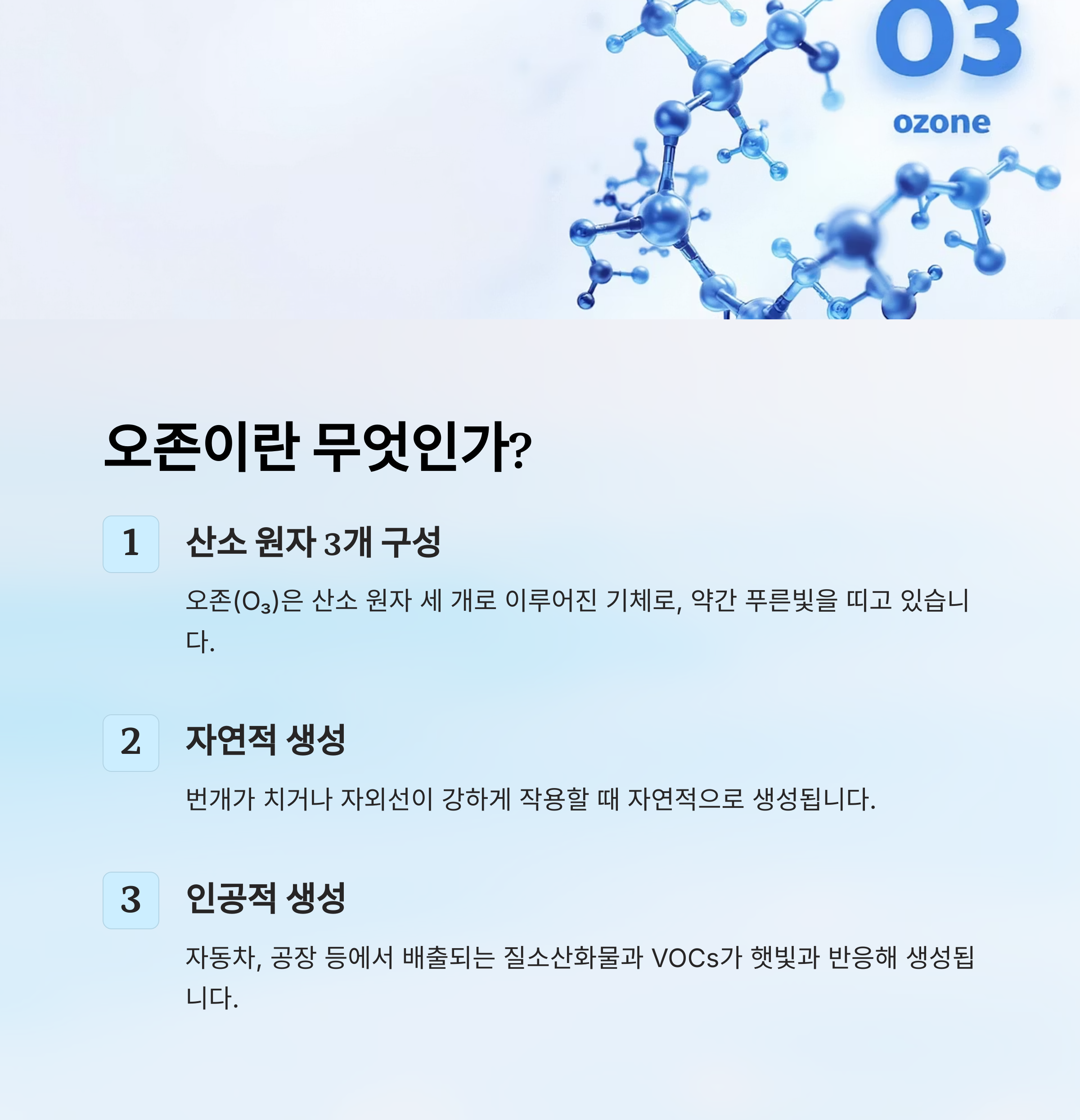 오존은 산소 원자 세 개로 구성된 화학식 O₃인 기체예요. 무색이거나 약간 푸른빛을 띠고, 해초나 전기 스파크 냄새와 비슷한 자극적인 향을 가지고 있어요. 자연상태에서는 번개가 치거나 자외선이 강하게 작용할 때 산소 분자가 분해되면서 오존이 생성돼요.