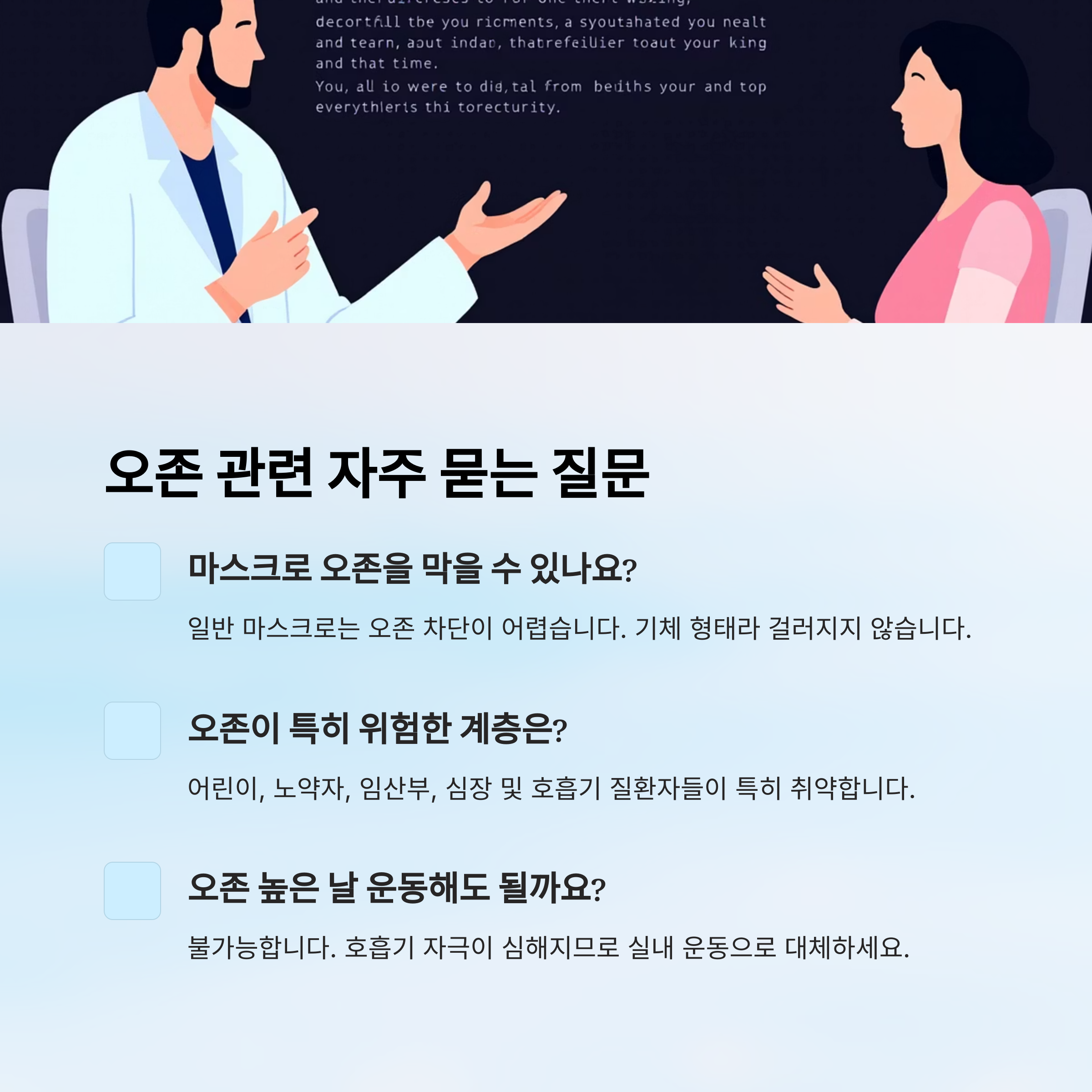 A3. 일반 마스크로는 오존 차단이 어려워요. 오존은 기체 형태라 걸러지지 않기 때문에 외출 자체를 피하는 것이 가장 효과적이에요.