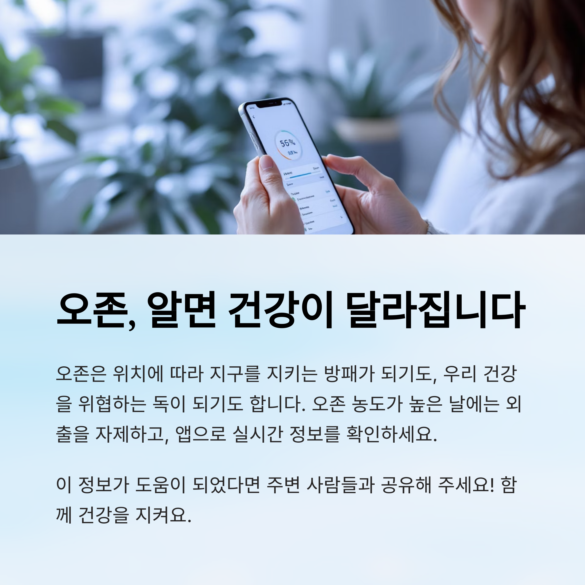 생활 속 작은 실천들이 오존으로 인한 피해를 줄일 수 있어요. 날씨 앱이나 환경부의 ‘에어코리아’ 앱을 통해 매일 오존 농도를 확인하면서 건강을 챙기는 습관을 들여보세요! 📱