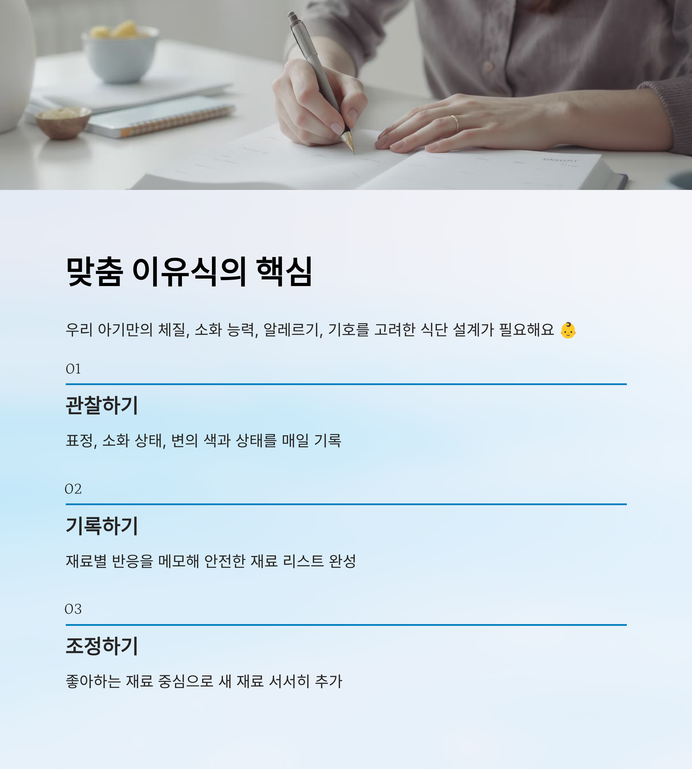 그럼 우리 아기에게 맞는 이유식을 어떻게 만들 수 있을까요? 다음 섹션에서는 ‘우리 아기 맞춤 이유식’을 위한 개념과 실제 적용법을 자세히 소개할게요 😊