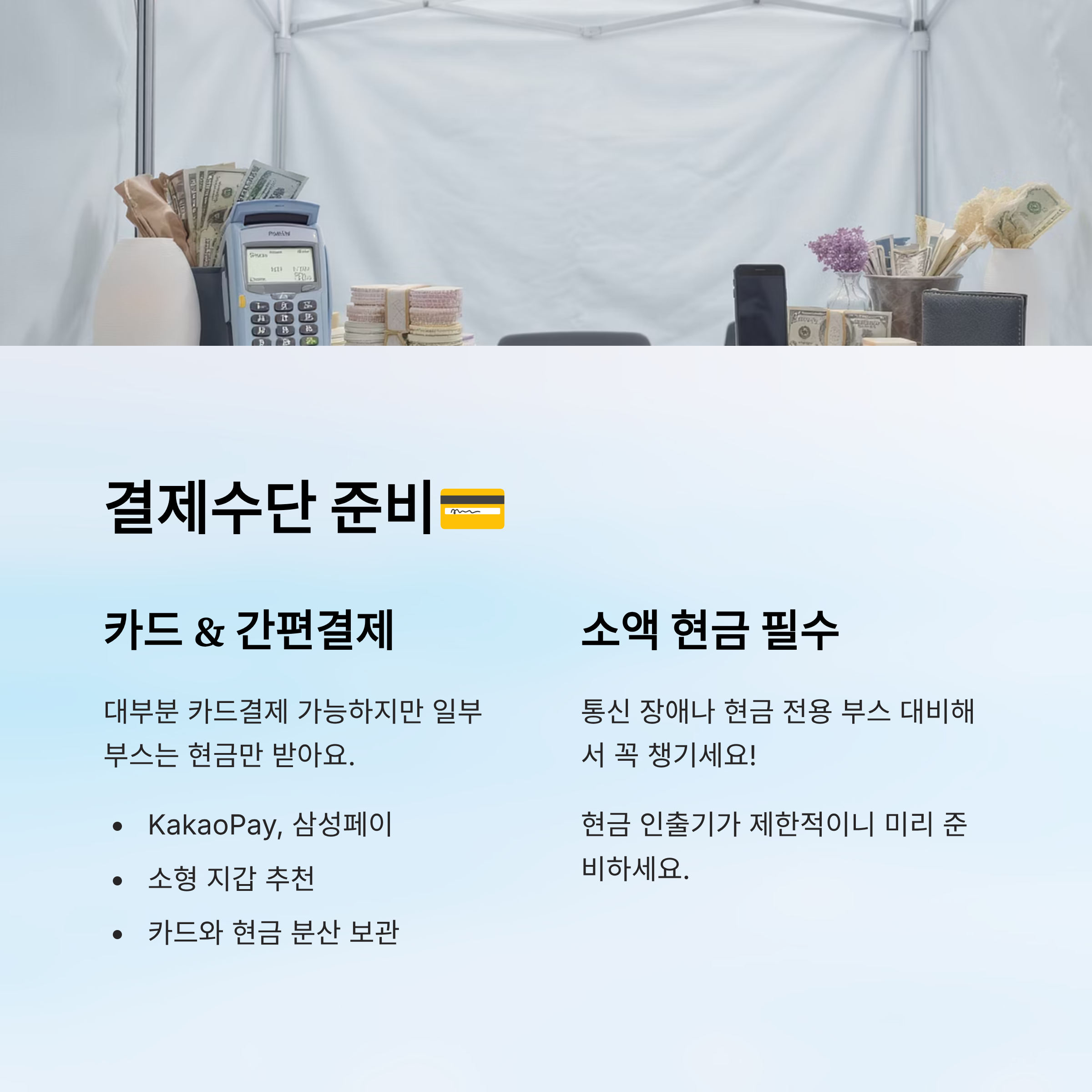 A7. 일부 부스는 현금만 받으니, 소액 현금도 꼭 챙기세요.