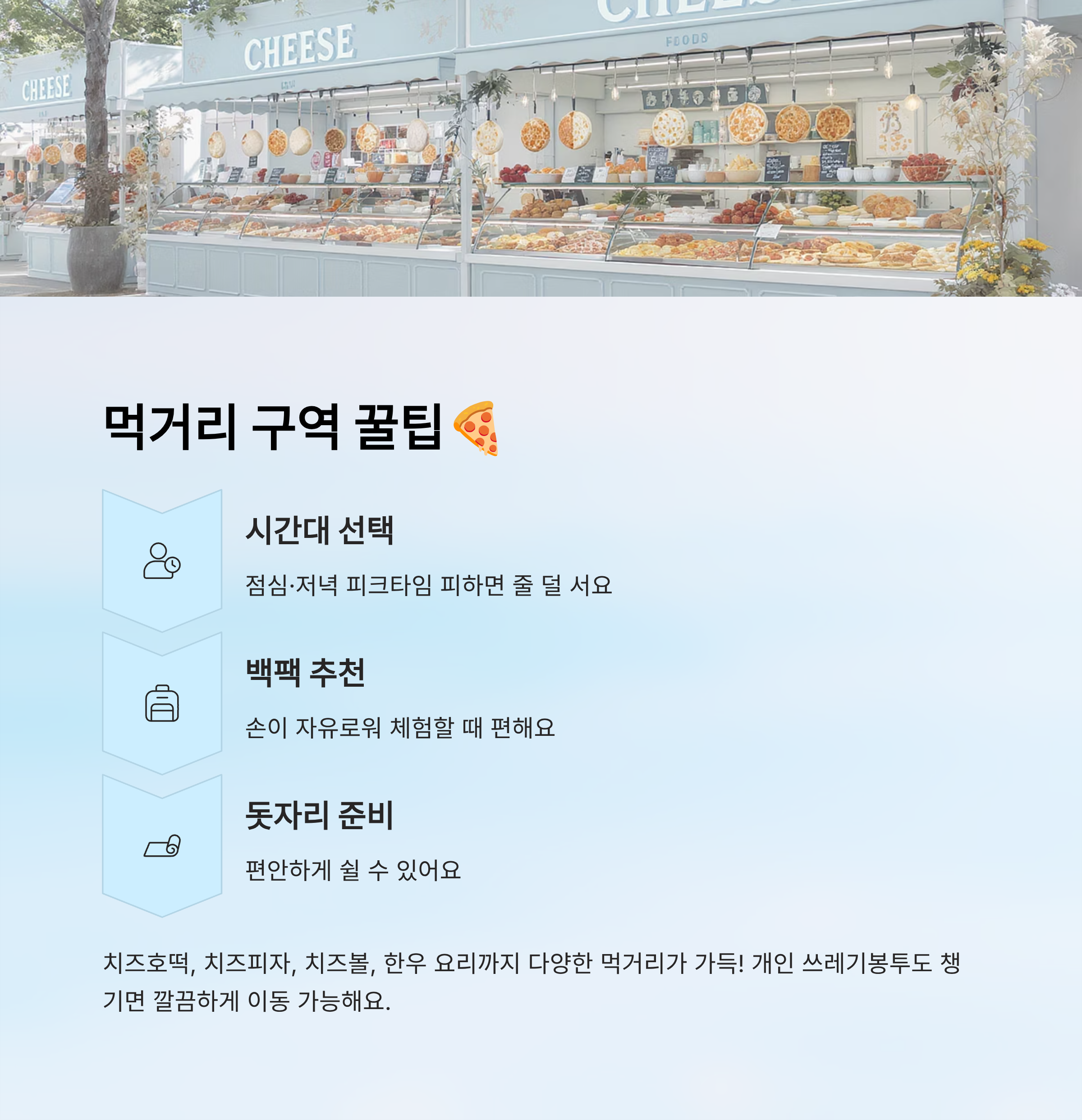 먹거리 부스는 점심시간과 저녁시간에 붐비기 때문에, 그 사이 시간대를 노리면 줄을 덜 서고 즐길 수 있어요. 음식을 먹은 후 버릴 수 있는 개인 쓰레기봉투도 챙기면 깔끔하게 이동 가능해요.