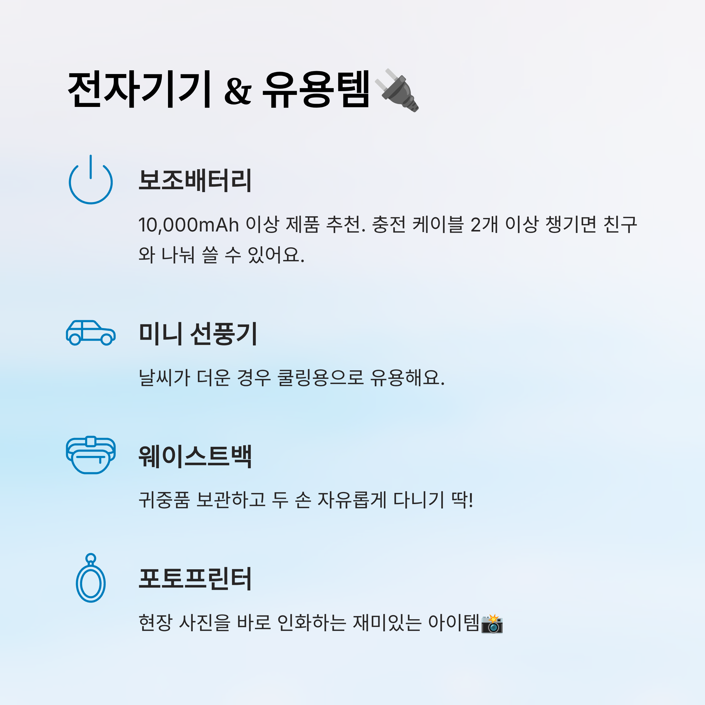 그 외에도 미니 선풍기(날씨가 더운 경우), 손전등 기능 있는 키링, 물건을 분리 보관할 수 있는 웨이스트백(허리 가방)이 유용해요. 귀중품을 넣고 두 손 자유롭게 다니기 딱 좋아요!
