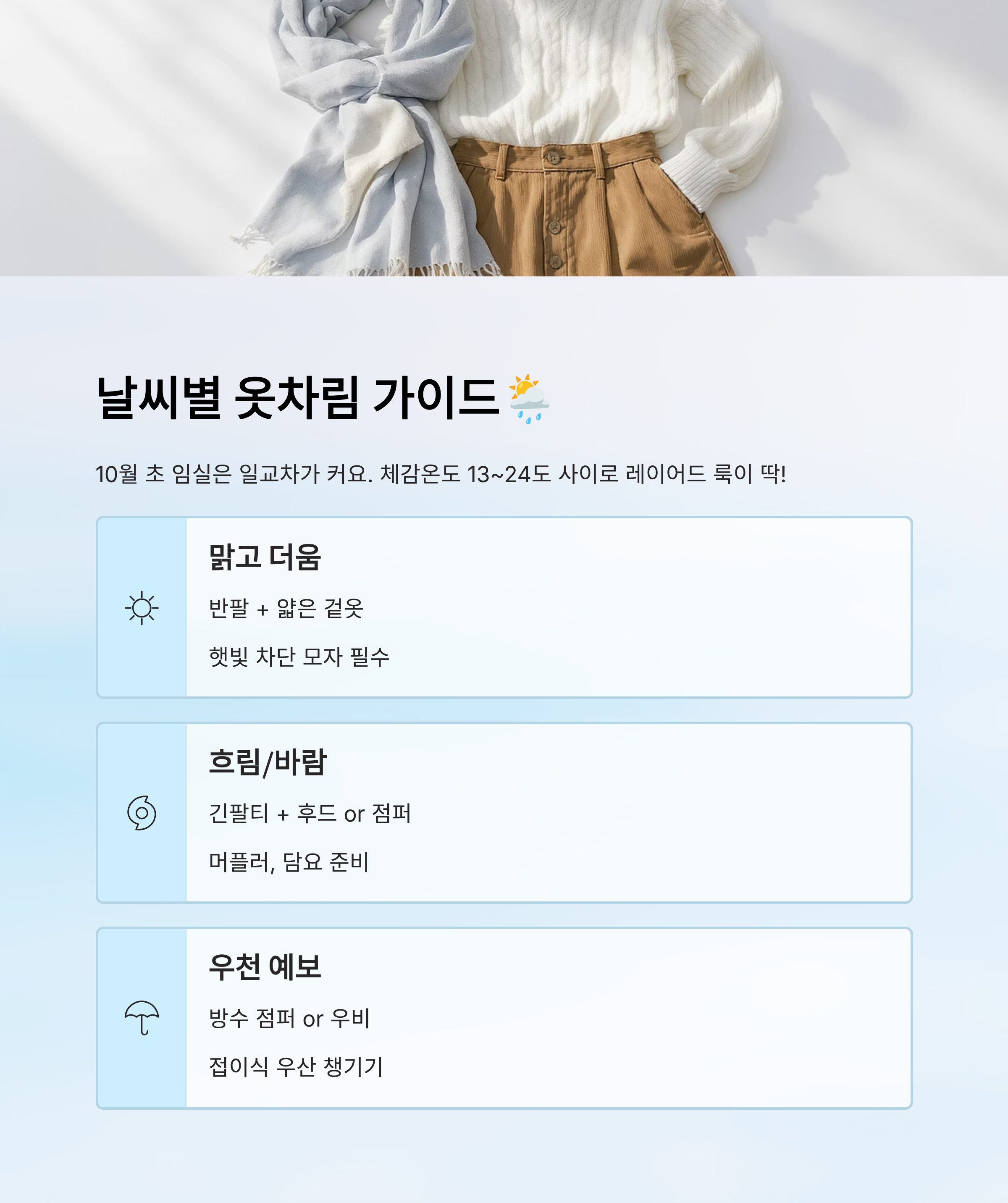 10월 초 임실은 일교차가 큰 시기예요. 아침과 밤은 쌀쌀하고 낮에는 햇빛이 따뜻하니, 겉옷을 꼭 챙기는 게 좋아요. 체감온도는 13~24도 사이로 예상돼요.🎽