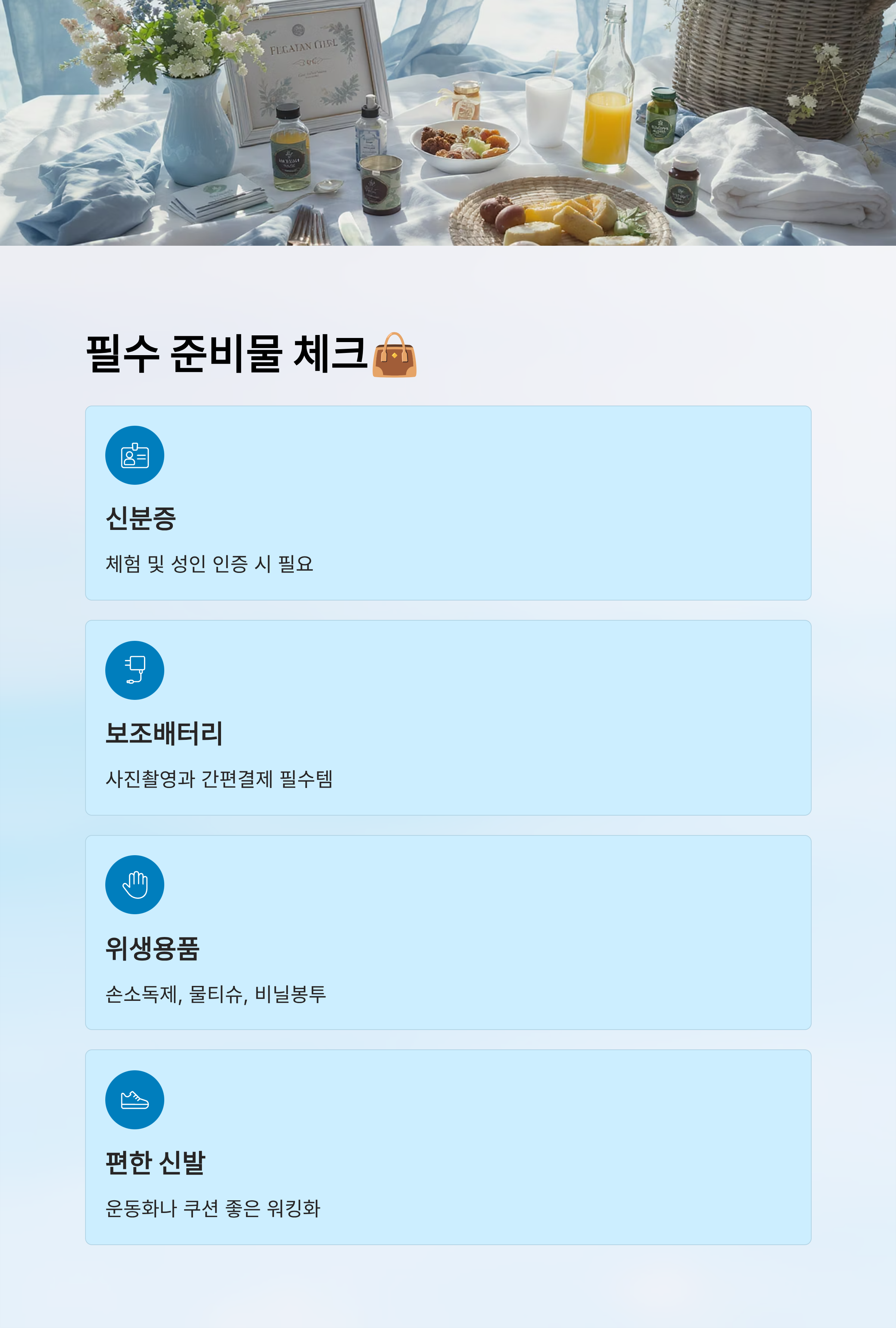 첫 번째는 신분증이에요. 일부 체험은 성인 인증이 필요할 수 있기 때문에 꼭 챙겨주세요. 두 번째는 휴대폰과 충전기, 그리고 요즘은 보조배터리까지 필수죠. 특히 사진 찍고 지도 확인하고 결제하려면 배터리 빨리 닳거든요.