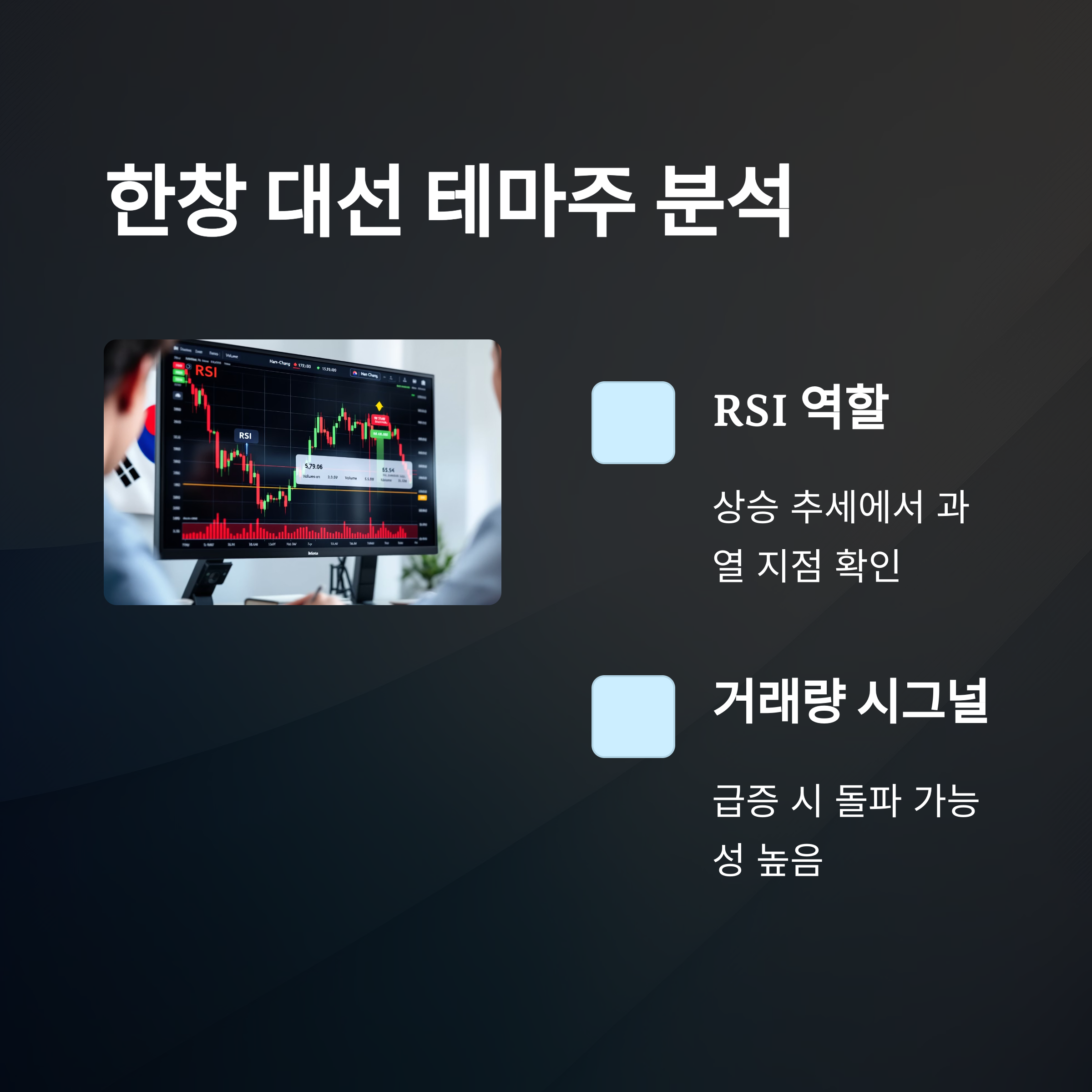 다음 문단에선 정치테마주에 공통적으로 적용되는 기술적 지표를 정리해드릴게요. 이 신호들만 체크해도 고수처럼 움직일 수 있어요!
