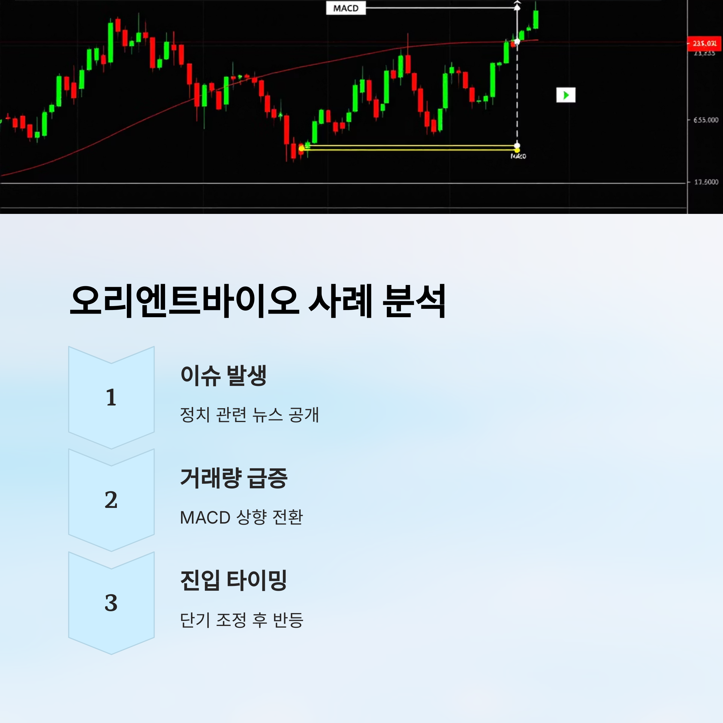 이런 차트 흐름은 단지 오리엔트바이오뿐만 아니라 대부분 정치 테마주에서 반복돼요. 거래량과 봉 형태만 잘 관찰해도 단기 고점과 저점 예측이 가능하다는 거예요. 항상 뉴스보다 ‘차트’를 먼저 보세요!