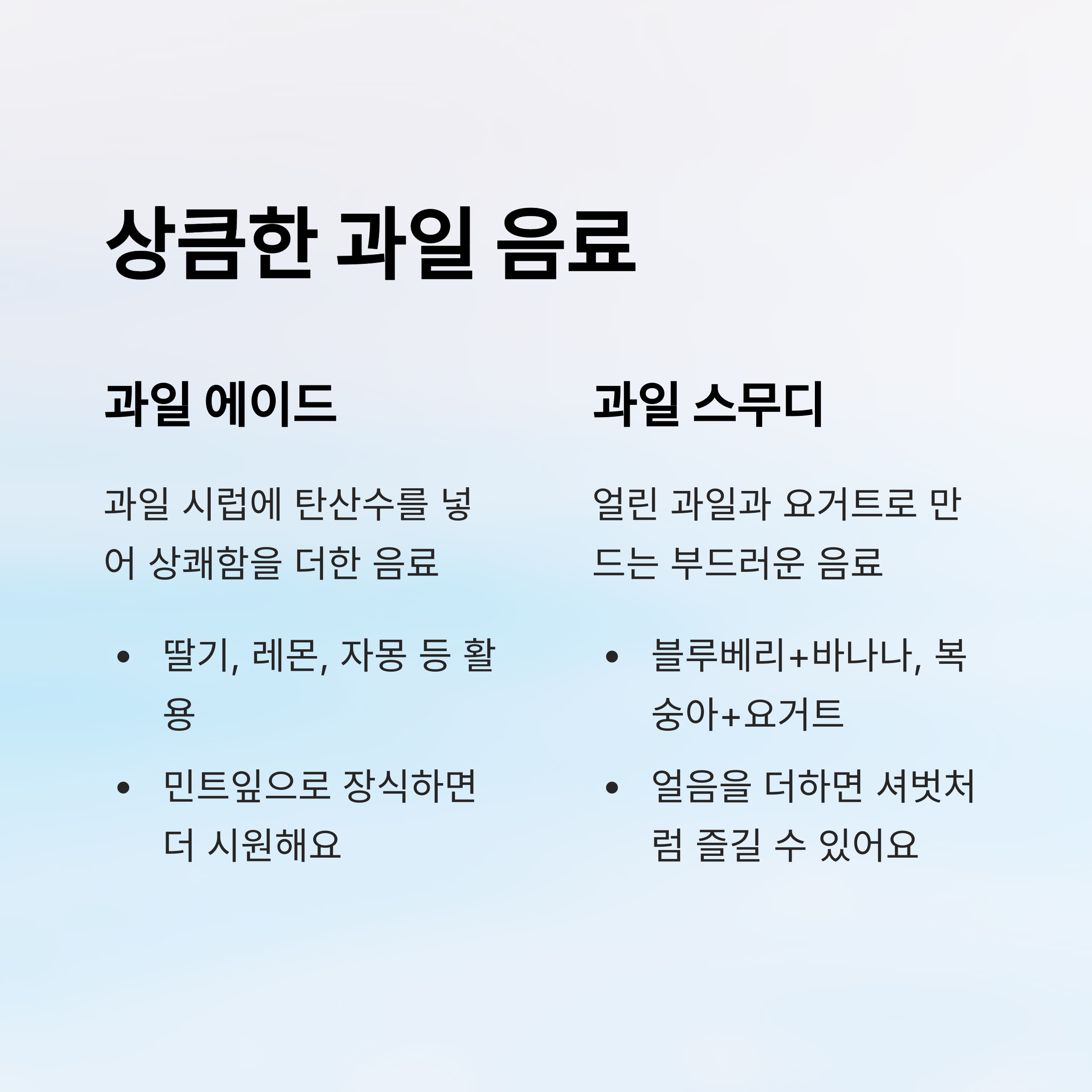 더운 여름엔 역시 시원한 과일 음료가 최고죠! 탄산의 상쾌함과 과일의 상큼함이 어우러진 에이드, 부드러운 질감의 스무디는 여름철 갈증 해소에 딱 맞아요. 집에서도 손쉽게 만들 수 있어요.