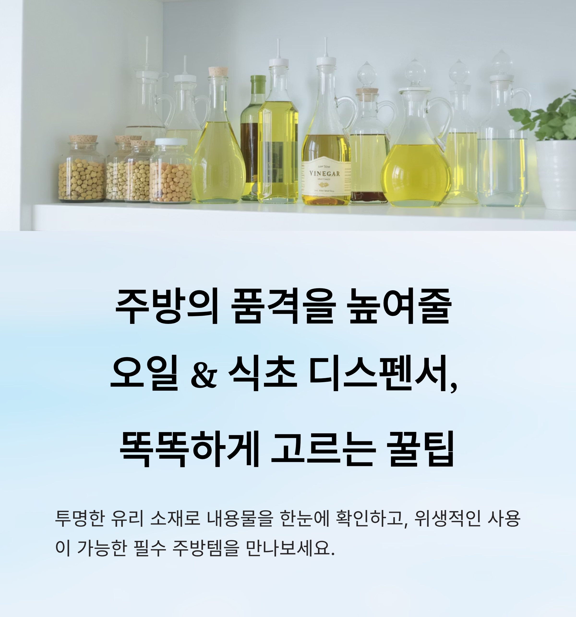 오일 & 식초 디스펜서 하나로 주방이 얼마나 깔끔해질 수 있는지 느껴지시나요?