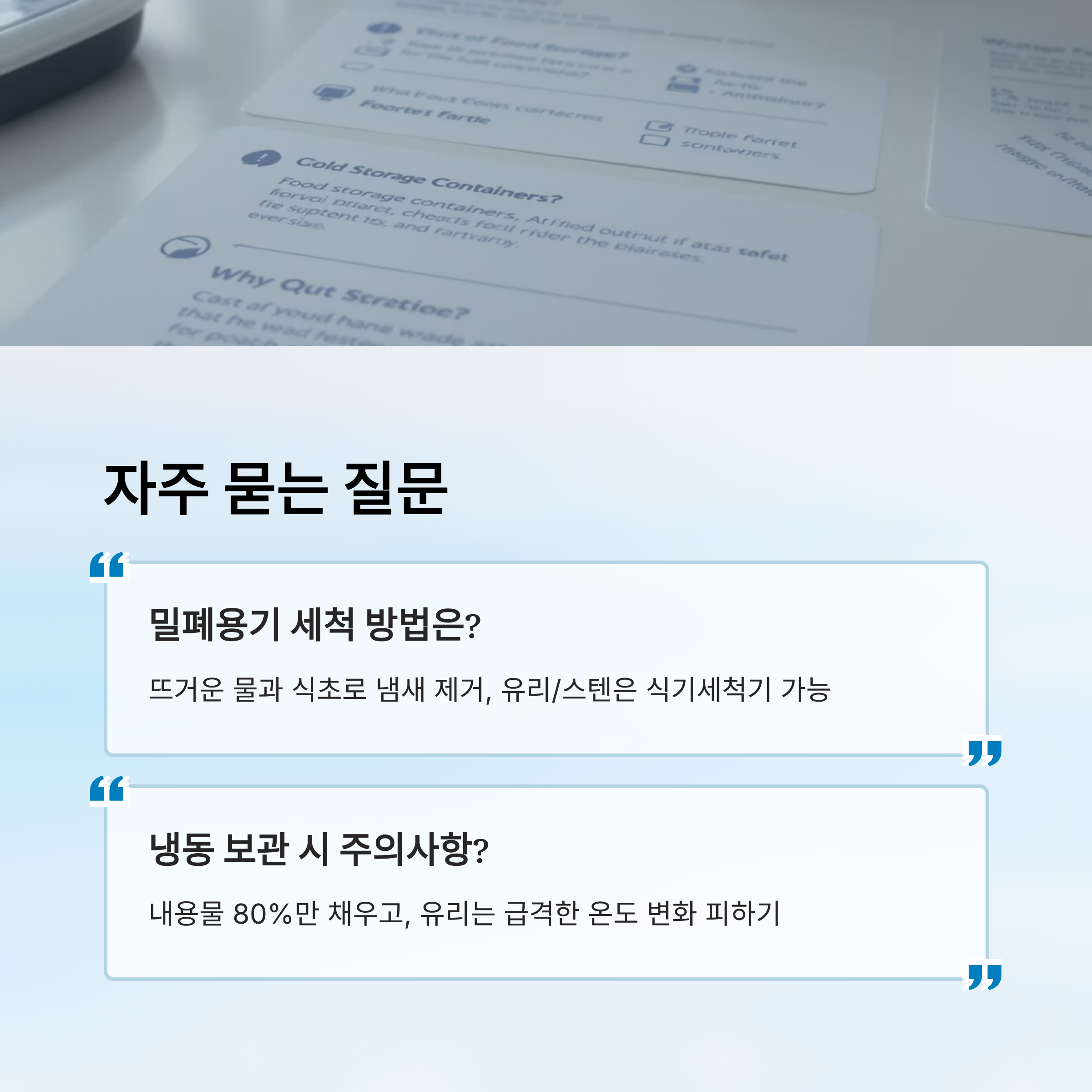 A: 주기적으로 분리해서 세척하고, 완전히 건조한 후 다시 끼워야 위생적이에요. - Q: 냉동실에 보관해도 되나요?