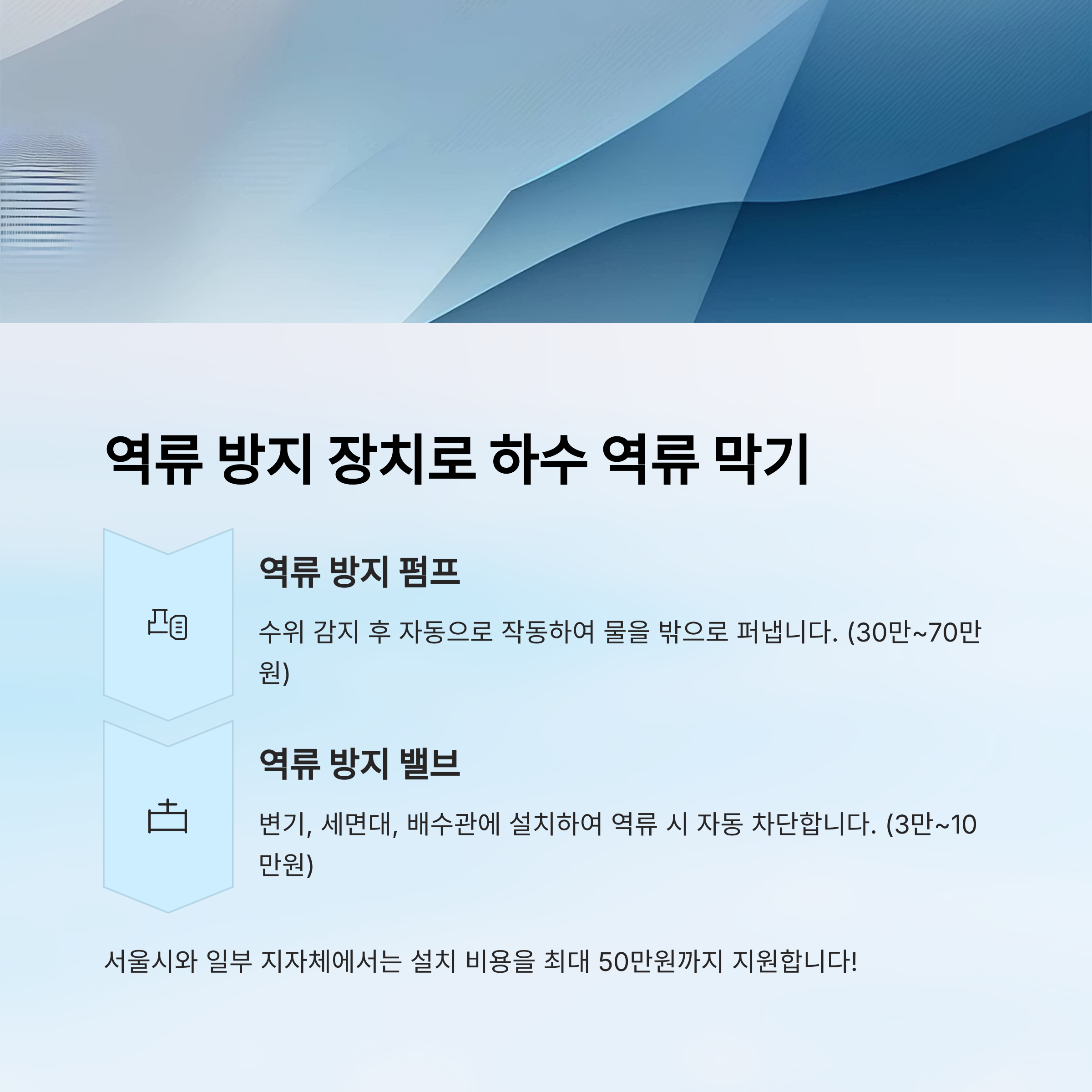 서울시와 일부 지자체에서는 역류 방지 설비 설치 비용을 일부 지원해주는 사업도 운영하고 있어요. 1가구당 최대 50만 원까지 지원받을 수 있어서 부담 없이 설치가 가능하죠. 신청은 주민센터나 구청 건축과를 통해 가능하니 폭우철 전에 꼭 알아보세요!