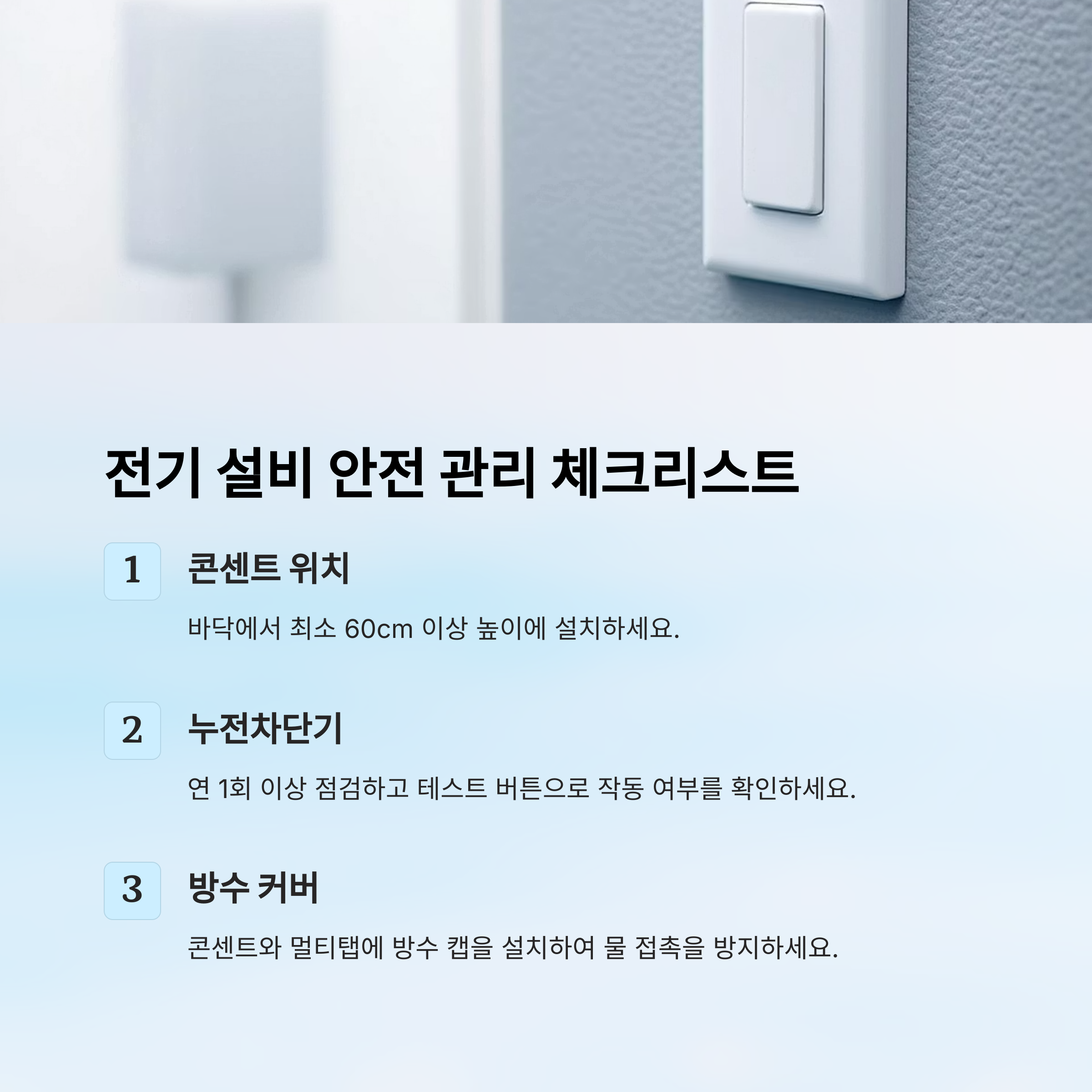 또 하나 중요한 건 방수 콘센트 커버예요. 콘센트나 멀티탭에 씌우는 방수 캡은 물이 직접 튀거나 스며드는 걸 막아줘요. 가격도 저렴하고 설치도 쉽기 때문에 침수 위험이 있는 공간엔 꼭 설치해두는 걸 추천해요. 특히 욕실 주변, 현관 근처, 보일러실 같은 곳은 더더욱 필수예요.