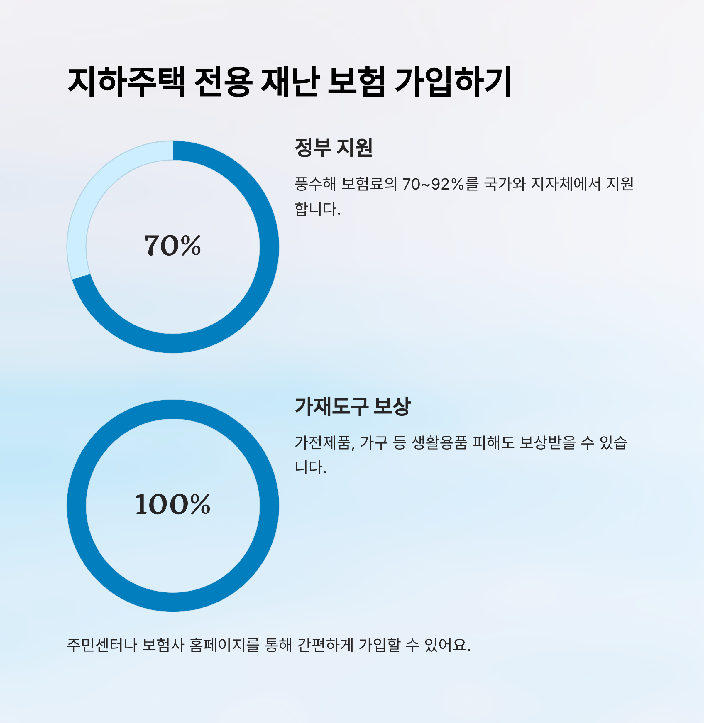 지하주택에 거주하면서 침수 피해를 완전히 막는 건 현실적으로 쉽지 않아요. 그래서 경제적 피해를 최소화하려면 ‘재난 보험’을 꼭 준비하는 게 좋아요. 특히 정부에서 운영하는 풍수해 보험은 저렴한 비용으로도 큰 보장을 받을 수 있어서 지하주택 거주자에게 아주 유용하답니다.