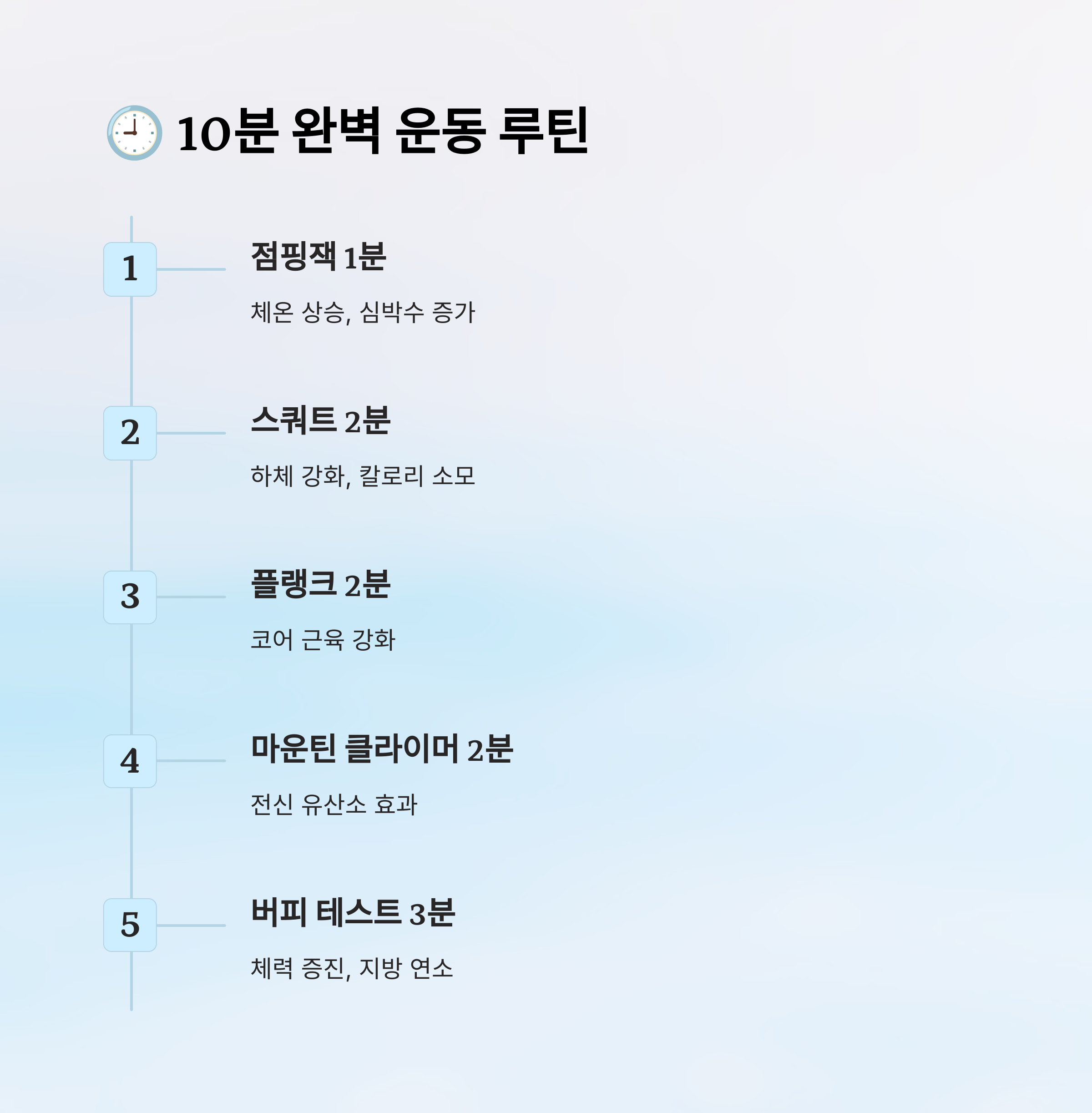 이렇게 구성된 10분 루틴은 시간이 짧지만 효과는 강력해요. 아침에 땀을 살짝 흘리는 것만으로도 기분이 완전히 달라져요. 무엇보다 반복할수록 근육이 적응해가면서 운동 능력도 자연스럽게 좋아져요.