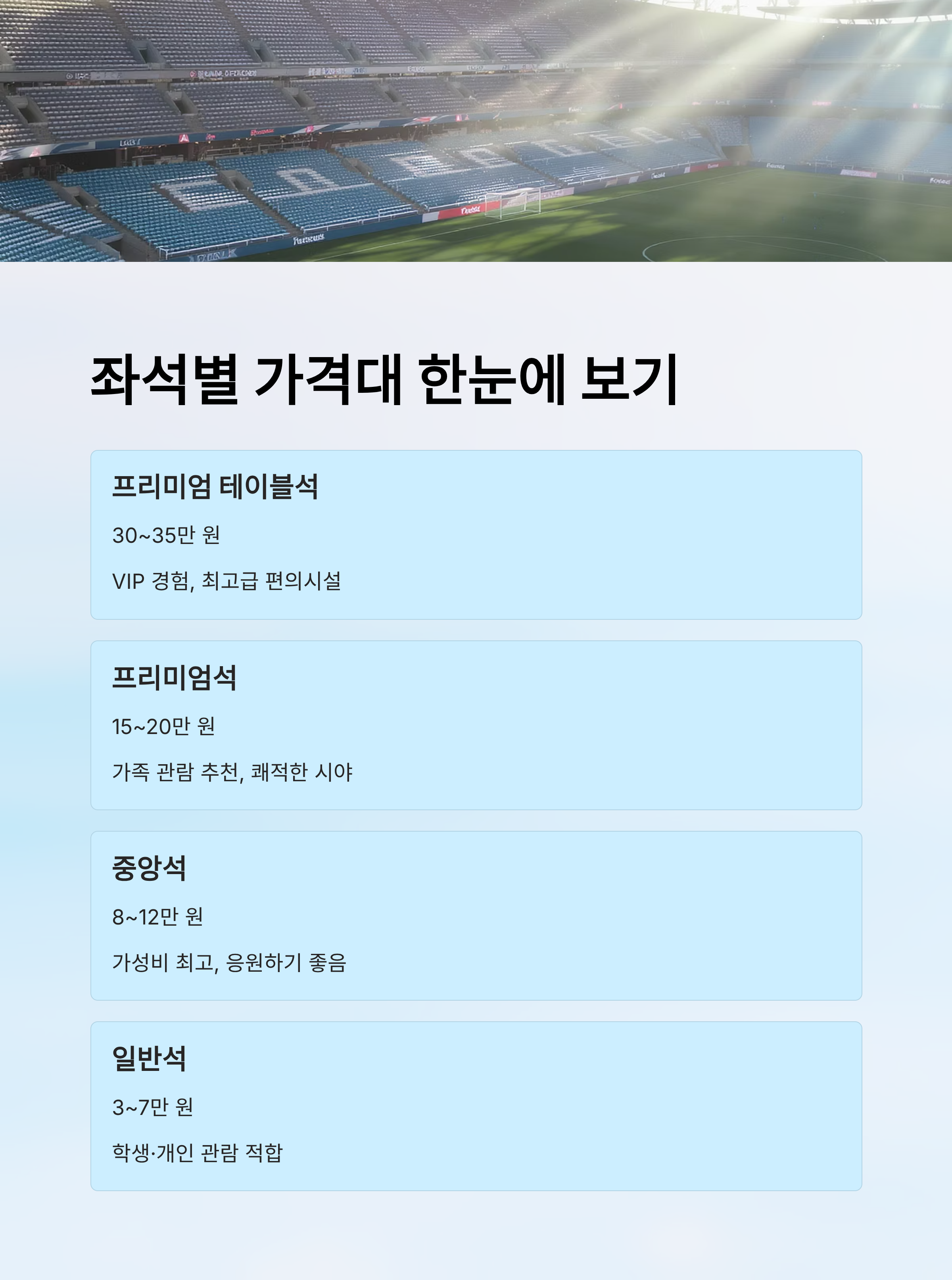 | 중앙석 | 8~12만 원 | 축구 팬 | ★★★★☆ |