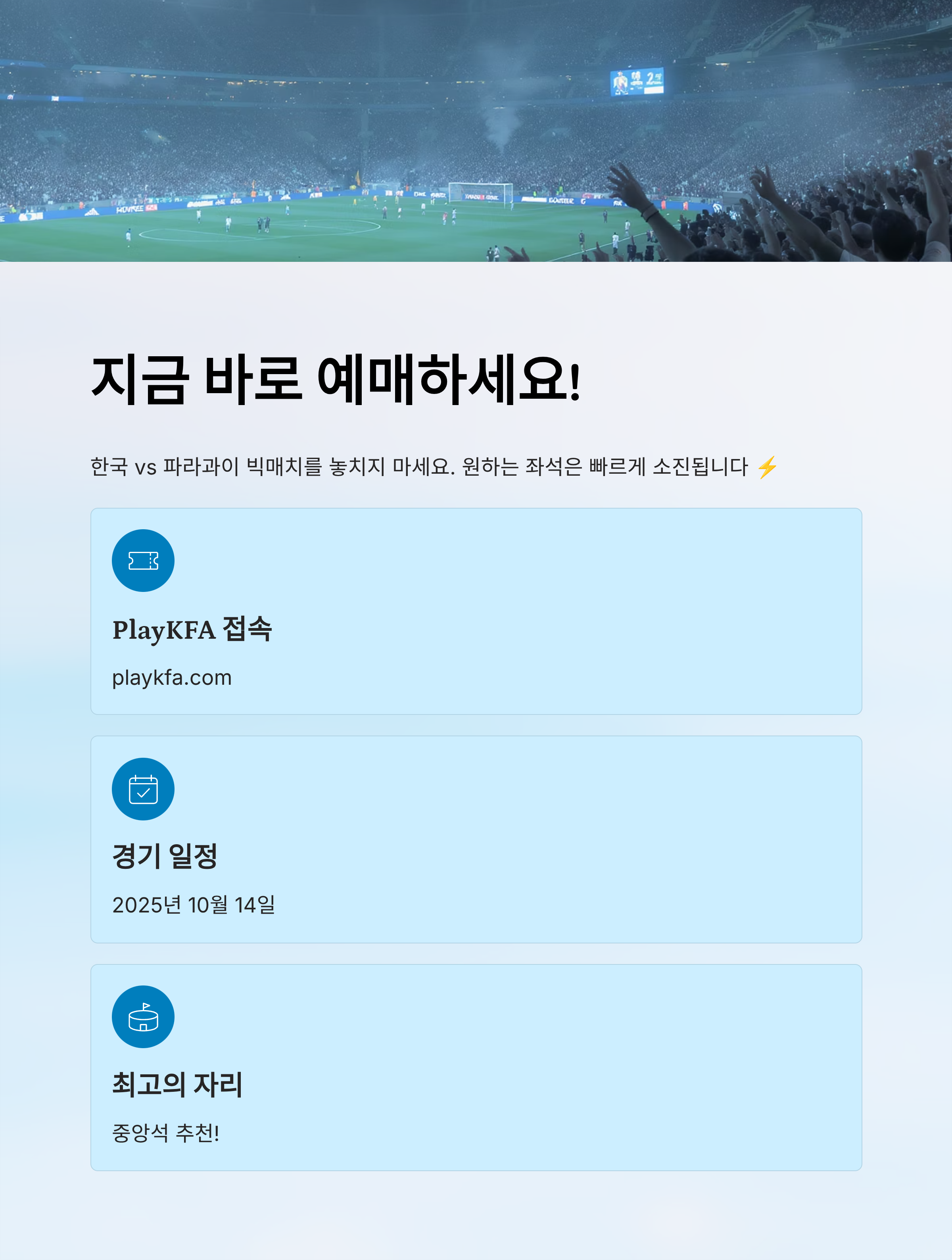📌 본 콘텐츠는 2025년 10월 기준으로 작성되었으며, 세부 정보(가격, 출전 선수, 환불 규정 등)는 변동될 수 있으니 반드시 PlayKFA 공식 사이트를 통해 최신 정보를 확인해 주세요.