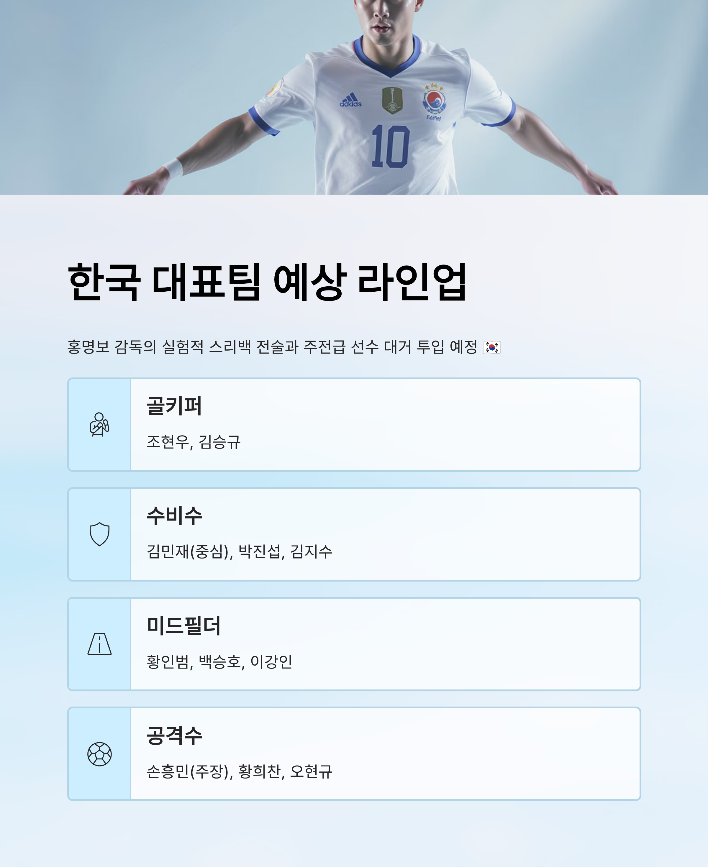 한국 대표팀은 최근 꾸준히 스리백 전술을 사용하고 있어요. 김민재가 중심이 된 수비라인은 더욱 안정감을 줄 것으로 예상되고요. 미드필더진에는 창의적인 플레이가 가능한 이강인과 황인범이 배치될 가능성이 높아요. 공격진에는 손흥민과 황희찬이 포진해 빠른 역습을 노릴 것으로 보여요.