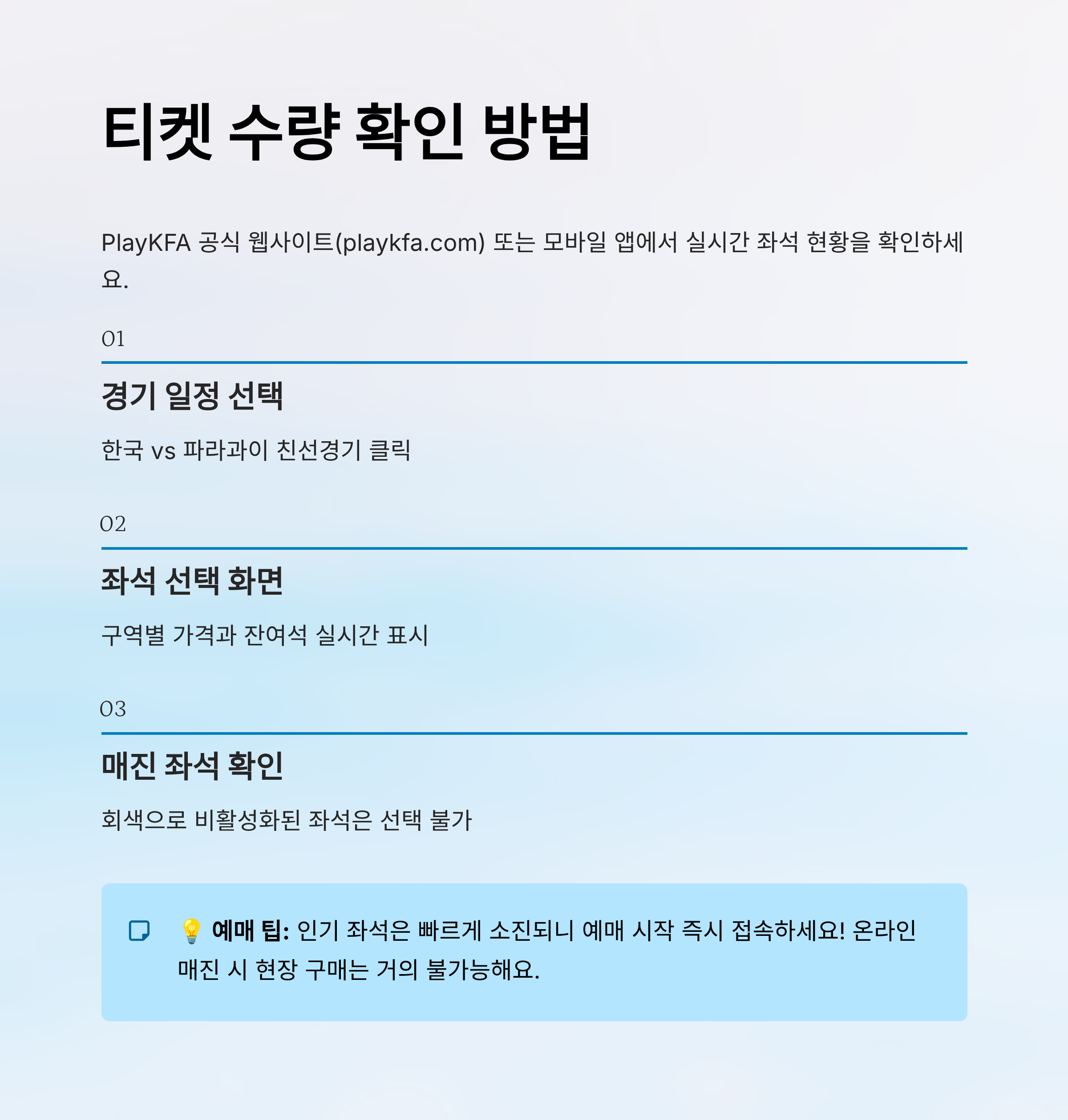 홈 화면에 있는 '예매 가능한 경기 목록'에서 ‘한국 vs 파라과이’ 친선경기를 찾아 클릭하면 좌석 선택 화면으로 넘어가요. 여기서 원하는 좌석 구역과 수량을 선택할 수 있어요. 좌석마다 가격이 다르게 표시되니 예산에 맞게 선택하면 좋겠죠?