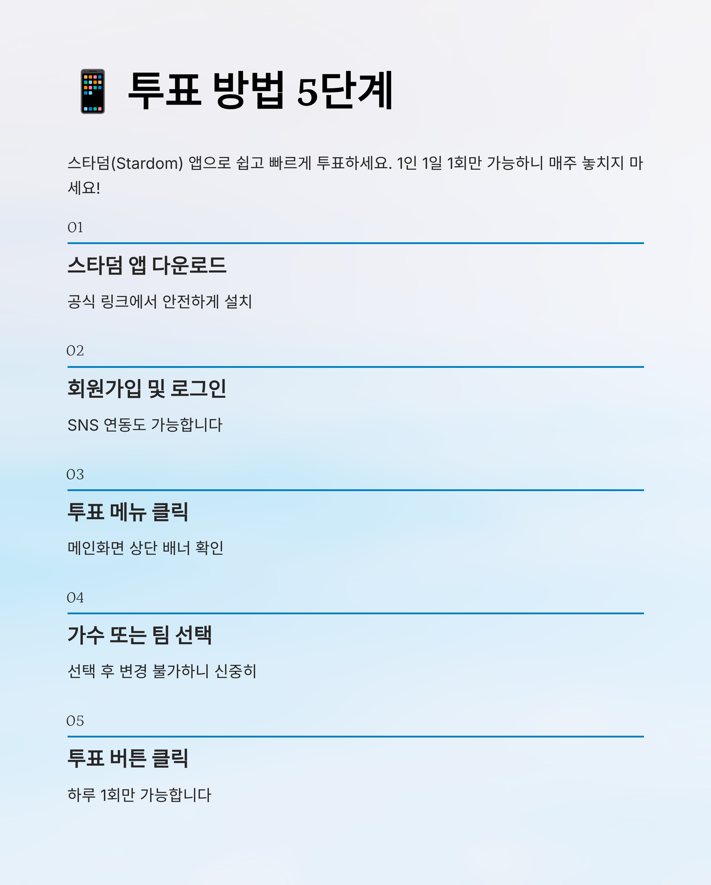 투표는 전용 앱 스타덤(Stardom)을 통해서 진행돼요. 이 앱은 안드로이드와 iOS 모두 지원하고 있어서, 스마트폰만 있으면 누구나 쉽게 참여할 수 있어요. 물론 실시간 투표 외에도 다양한 팬 참여 콘텐츠도 함께 즐길 수 있죠.
