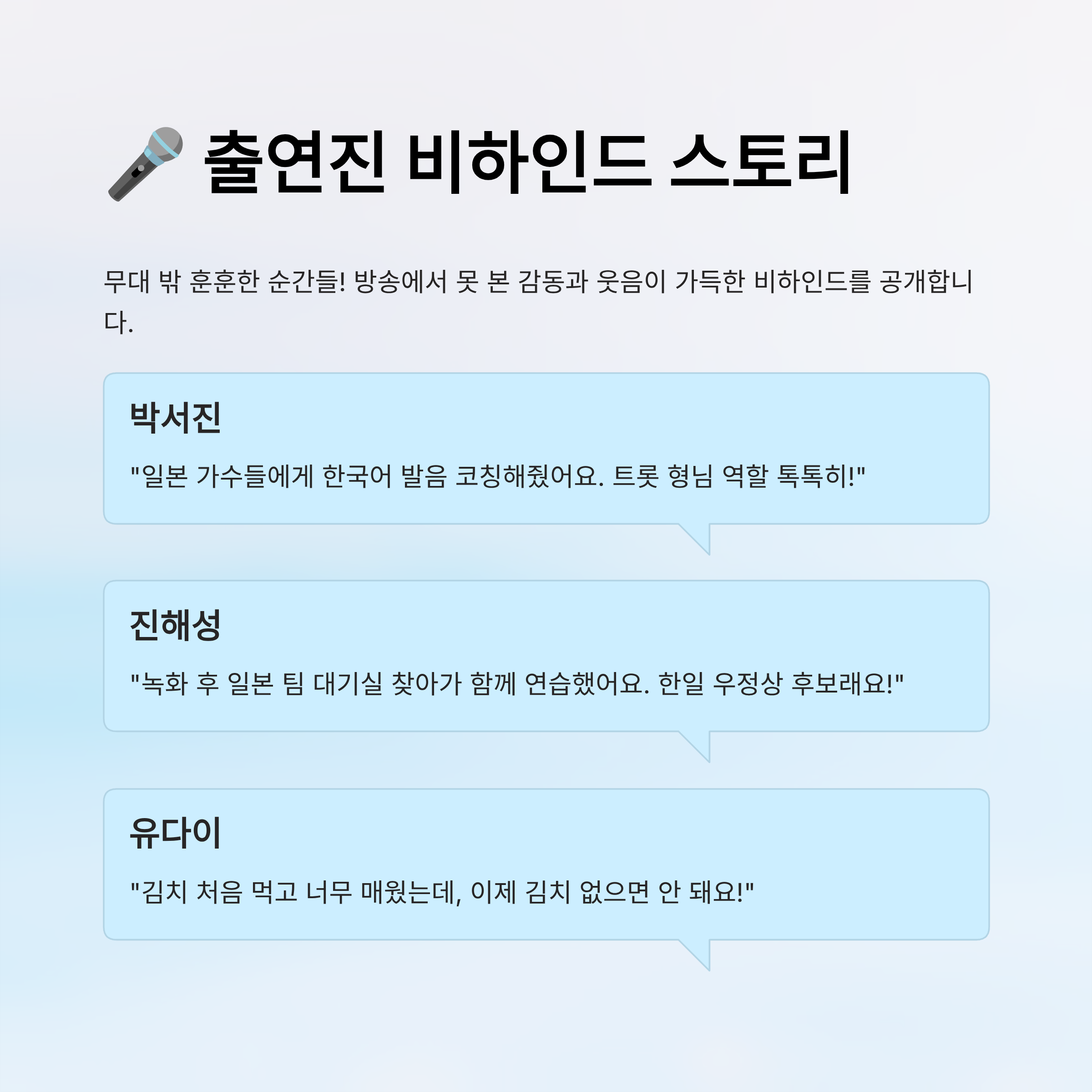 ‘한일가왕전2’의 진짜 재미는 무대 위가 아니라 무대 밖, 비하인드 스토리에 숨어 있어요. 방송에서는 편집으로 다 보여주지 못했던 감동, 웃음, 인간적인 매력이 넘치는 순간들이 많답니다. 팬이라면 이 이야기들, 절대 놓치면 안 돼요!