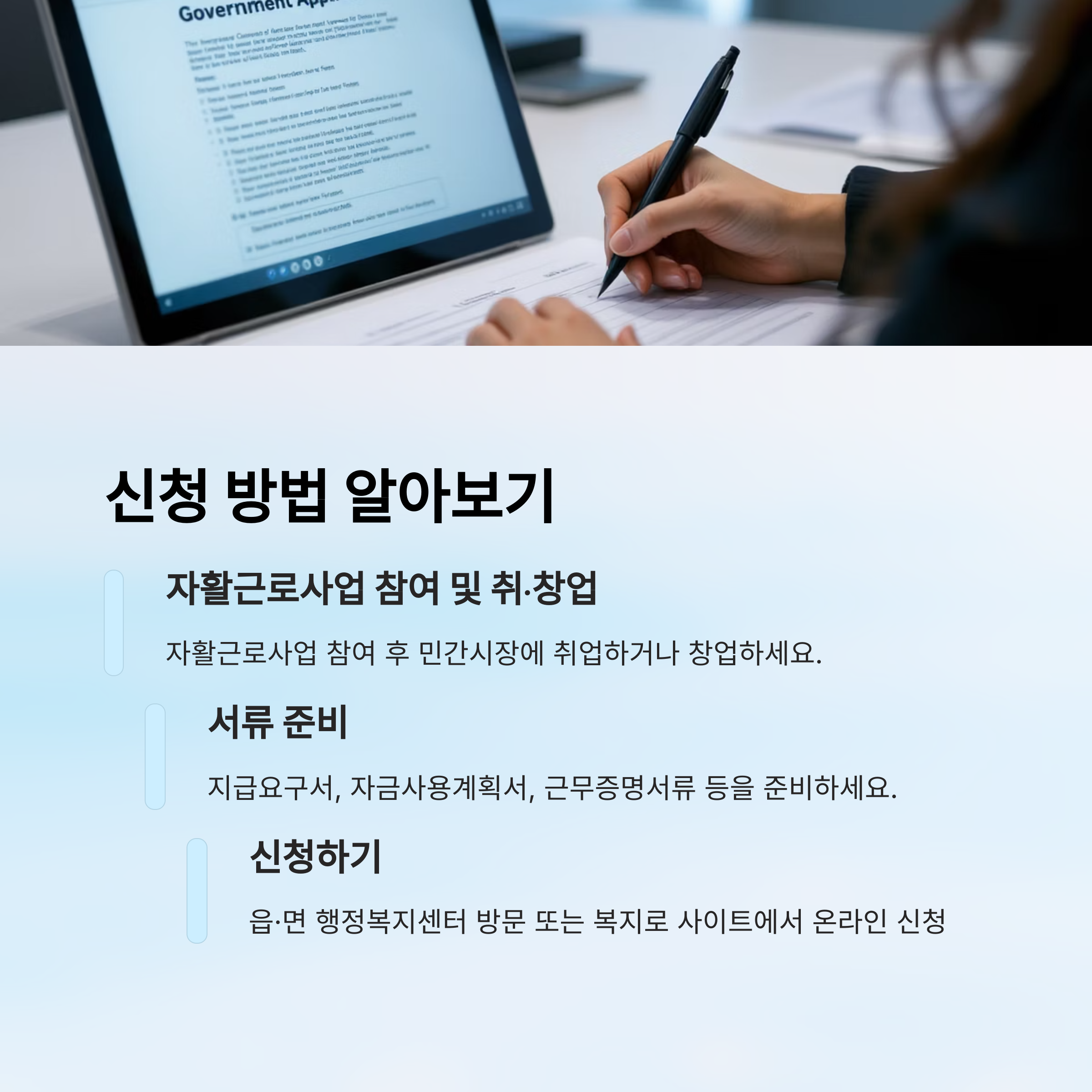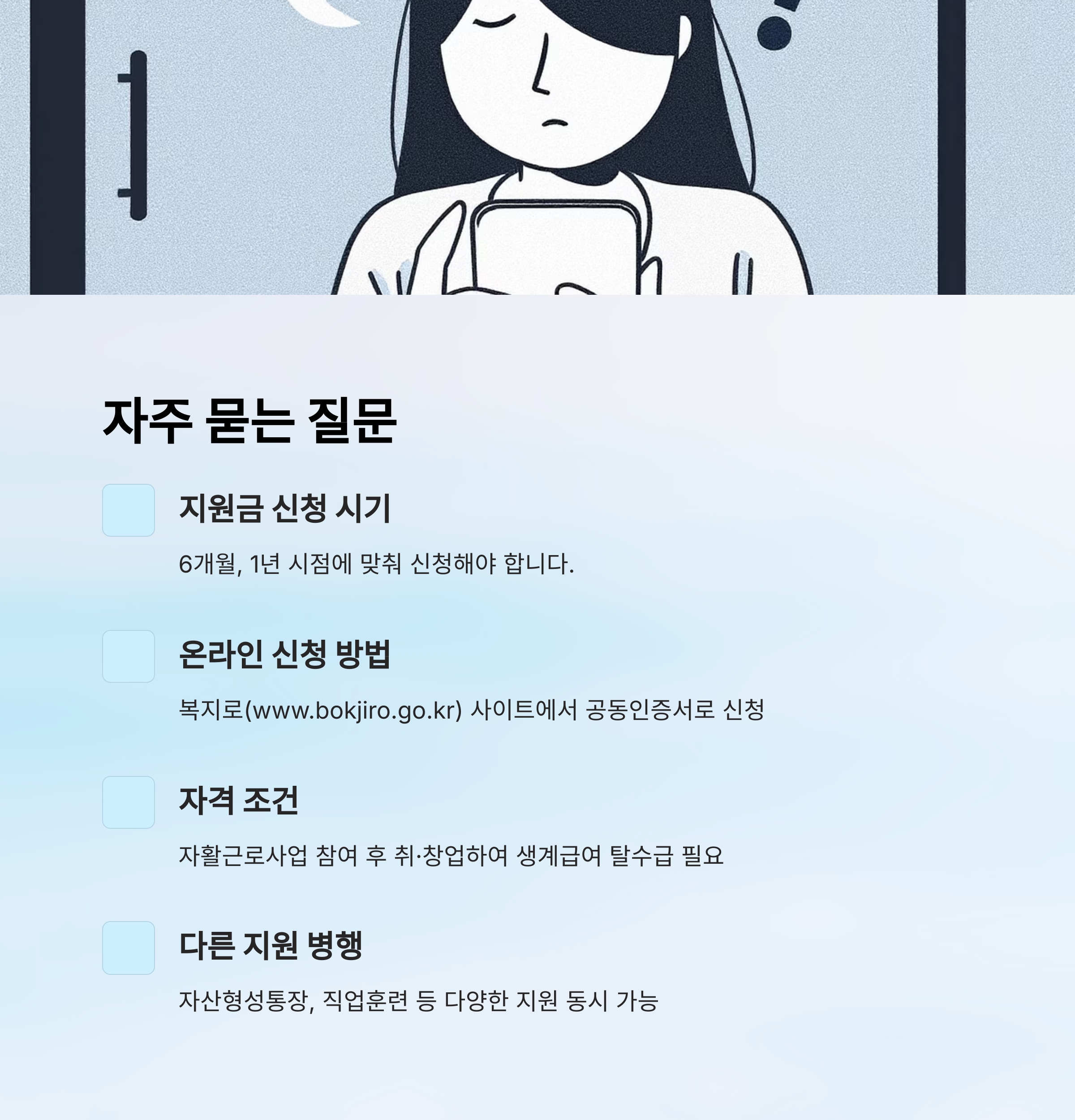 자격 조건이 충족되었는지는 읍면동 주민센터나 지역자활센터에서 상담을 통해 빠르게 확인할 수 있어요. 방문 전에 전화 문의해 보면 더 효율적일 수 있어요. 💼