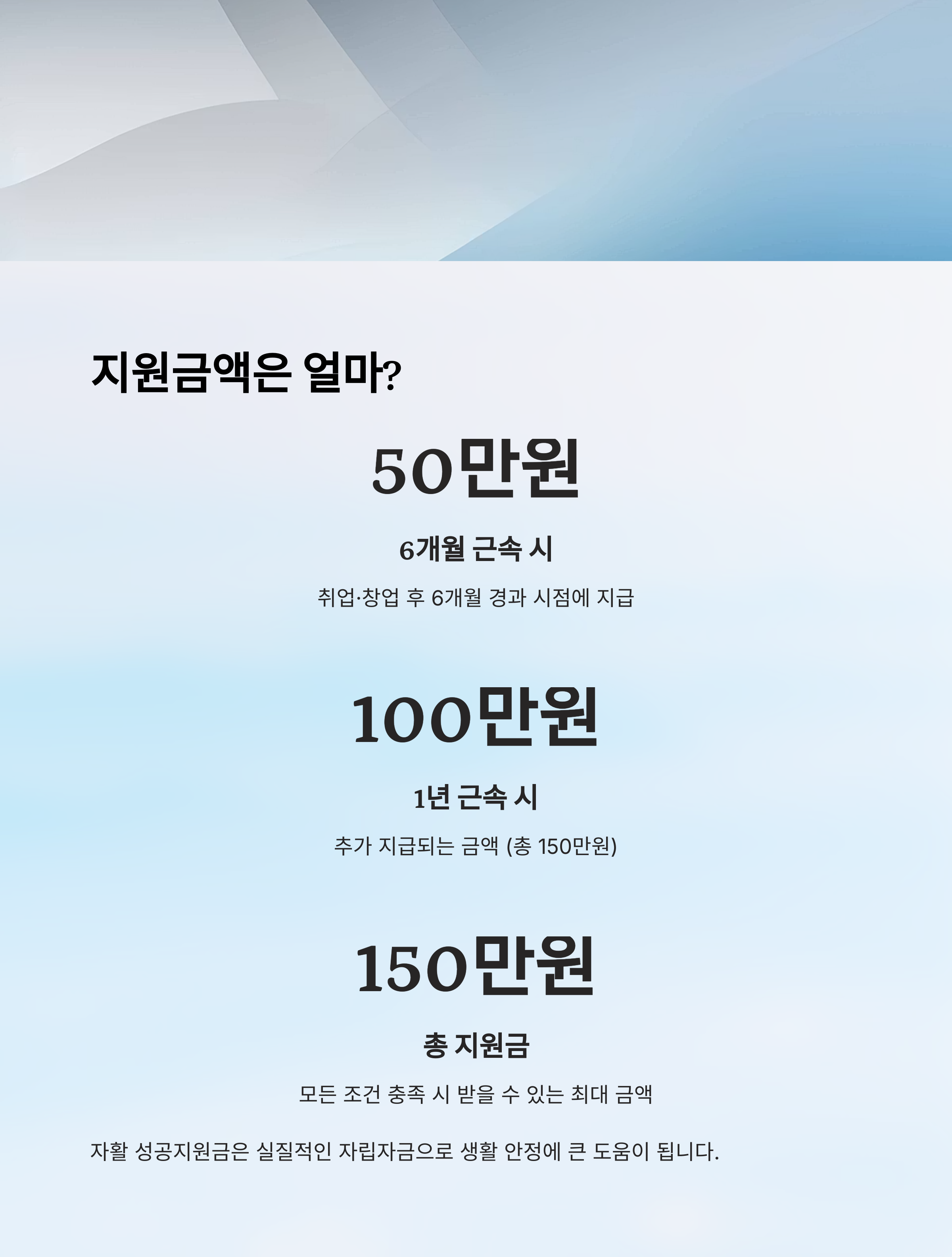 이어 1년 이상 근속하면 추가로 100만 원이 지급되는데요. 이는 자활 성공자의 장기 근속과 생활 안정을 위한 지원이에요. 총 150만 원이라는 금액은 생계를 꾸리는 데 있어 결코 적지 않은 도움을 줄 수 있어요.