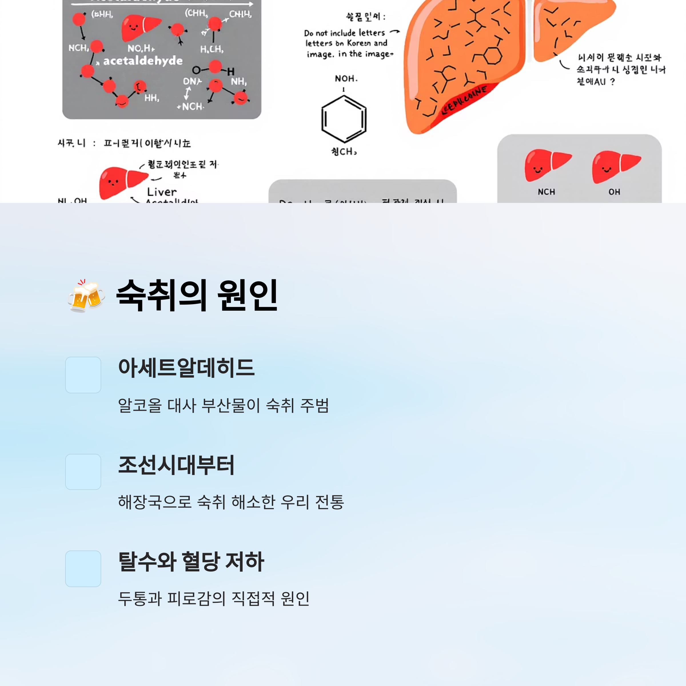 술을 마신 다음날 느껴지는 그 끔찍한 숙취... 도대체 왜 생기는 걸까요? 숙취는 알코올이 체내에서 아세트알데하이드로 분해되는 과정에서 생기는 독성물질 때문에 생겨요. 간에서 이를 다시 분해해 제거하지만, 양이 많거나 회복 능력이 떨어지면 두통, 구토, 메스꺼움 같은 증상이 나타나게 돼요.