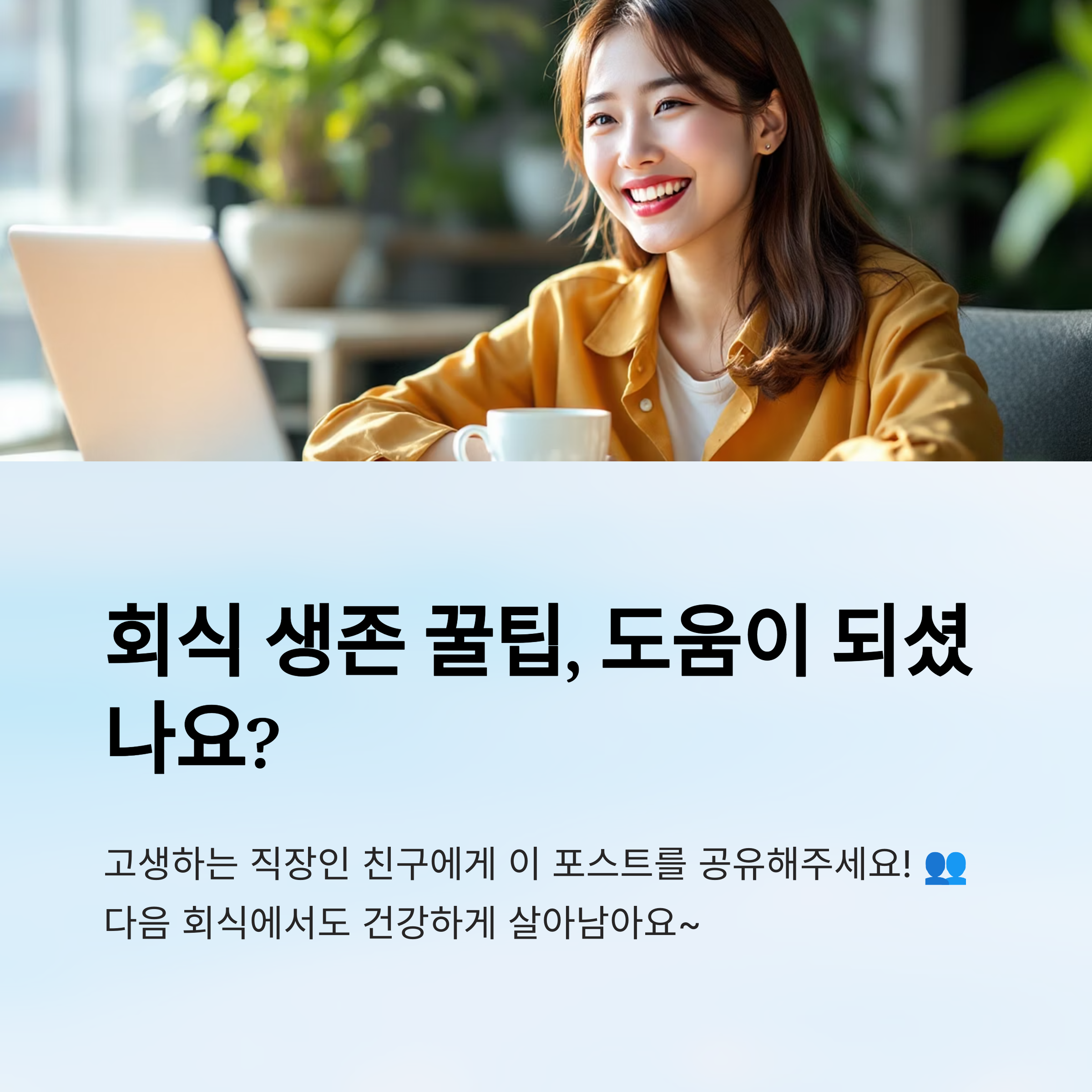 8️⃣ 다음날 일정을 여유롭게 – 회식 전날 중요한 회의나 프레젠테이션 일정은 피하는 게 좋아요. 충분히 휴식할 수 있는 시간표를 짜는 것도 회식의 일부분이라고 생각해보세요.