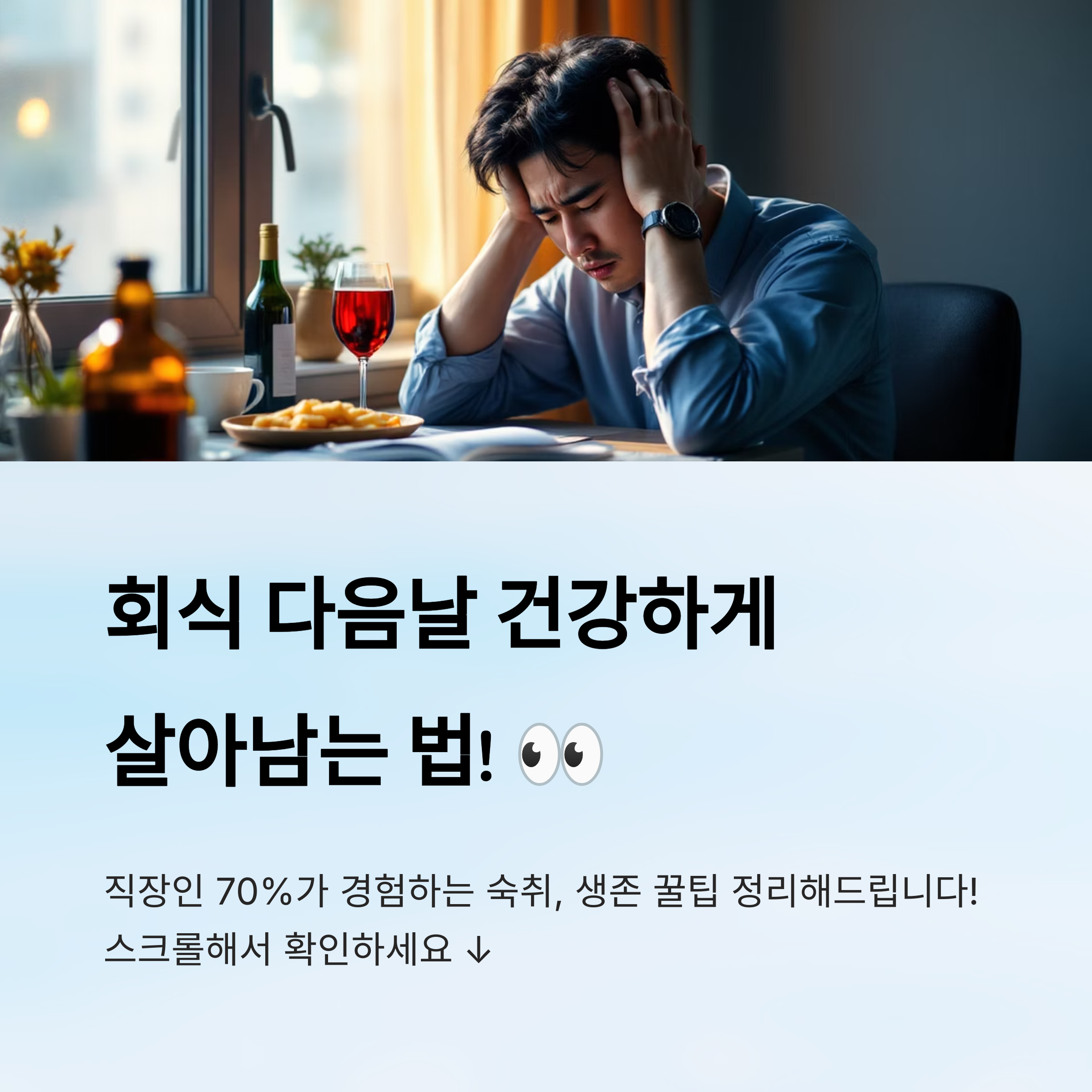 1️⃣ 공복 금지 – 절대 빈속에 술 마시면 안 돼요! 위 점막이 그대로 알코올에 노출되면서 숙취는 물론이고 속쓰림까지 올 수 있어요. 회식 전엔 간단한 밥, 바나나, 두유 등으로 위를 보호해줘야 해요.