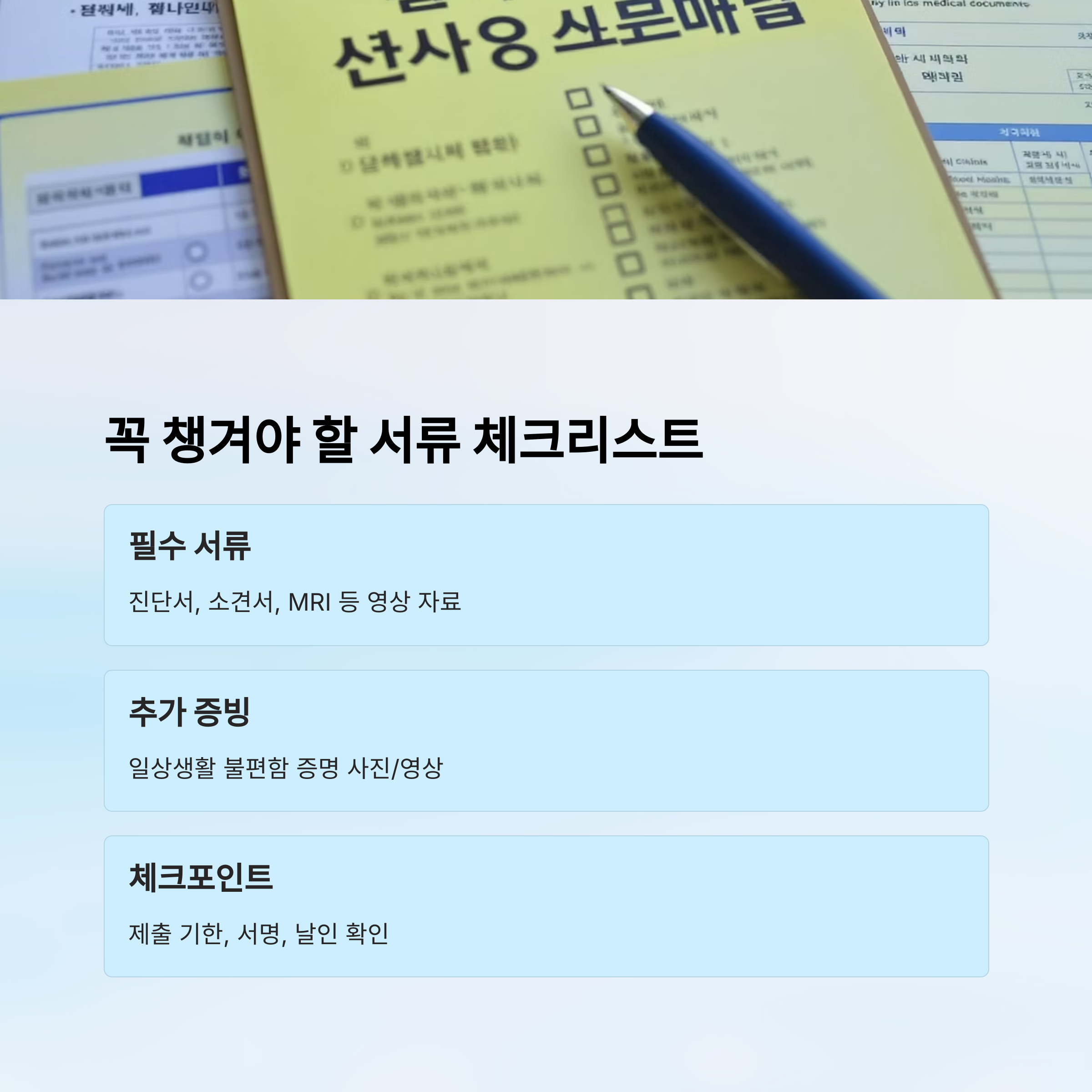 하지만 많은 분들이 진단서 하나 내고 기다리는 실수를 해요. 중요한 건 ‘증명 자료’를 얼마나 촘촘하게 제출하느냐랍니다!