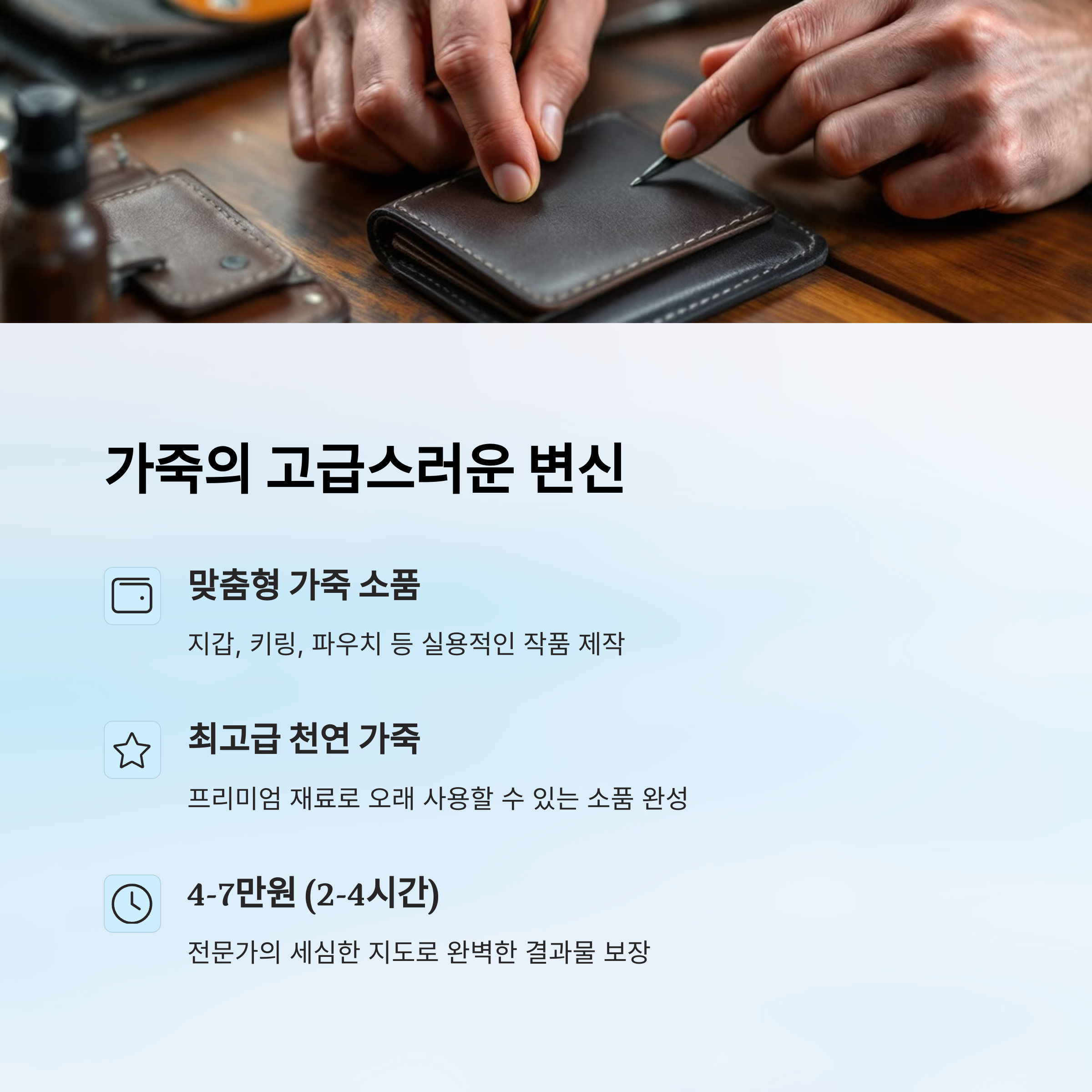가죽 공예는 소품부터 실용적인 가방, 지갑까지 만들 수 있는 인기 있는 DIY 체험이에요. 나만의 스타일을 담은 핸드메이드 제품을 직접 만들어서 사용하면 만족감이 두 배로 커져요. 🧵🧡