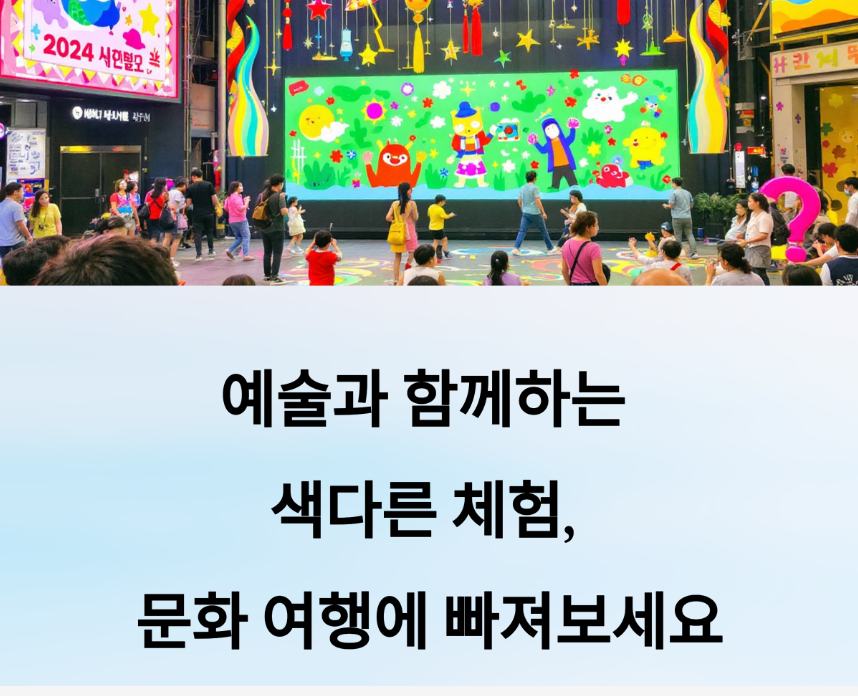 A3. 네! 탈춤 체험, 미디어 아트 관람, 간단한 페인팅 클래스 등 어린이 대상 프로그램도 많아요.