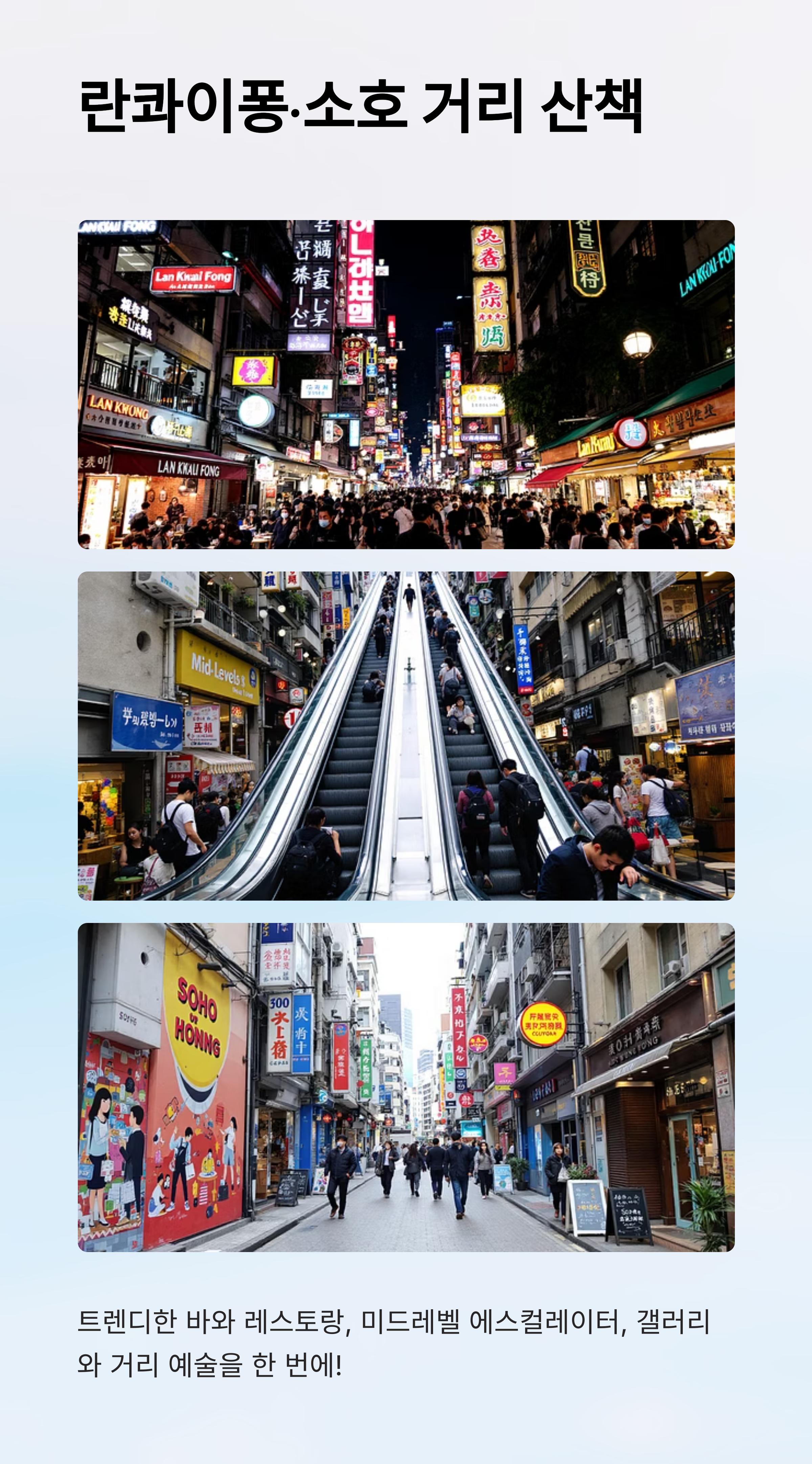 란콰이퐁(Lan Kwai Fong)과 소호(Soho)는 홍콩의 밤 문화를 제대로 즐길 수 있는 곳이에요. 란콰이퐁은 활기찬 바와 클럽으로 가득 차 있어 친구들과 즐거운 시간을 보내기에 좋아요. 반면 소호는 세련된 레스토랑과 아트 갤러리, 독특한 상점들이 많아 여유롭게 산책하기 좋은 곳이랍니다.