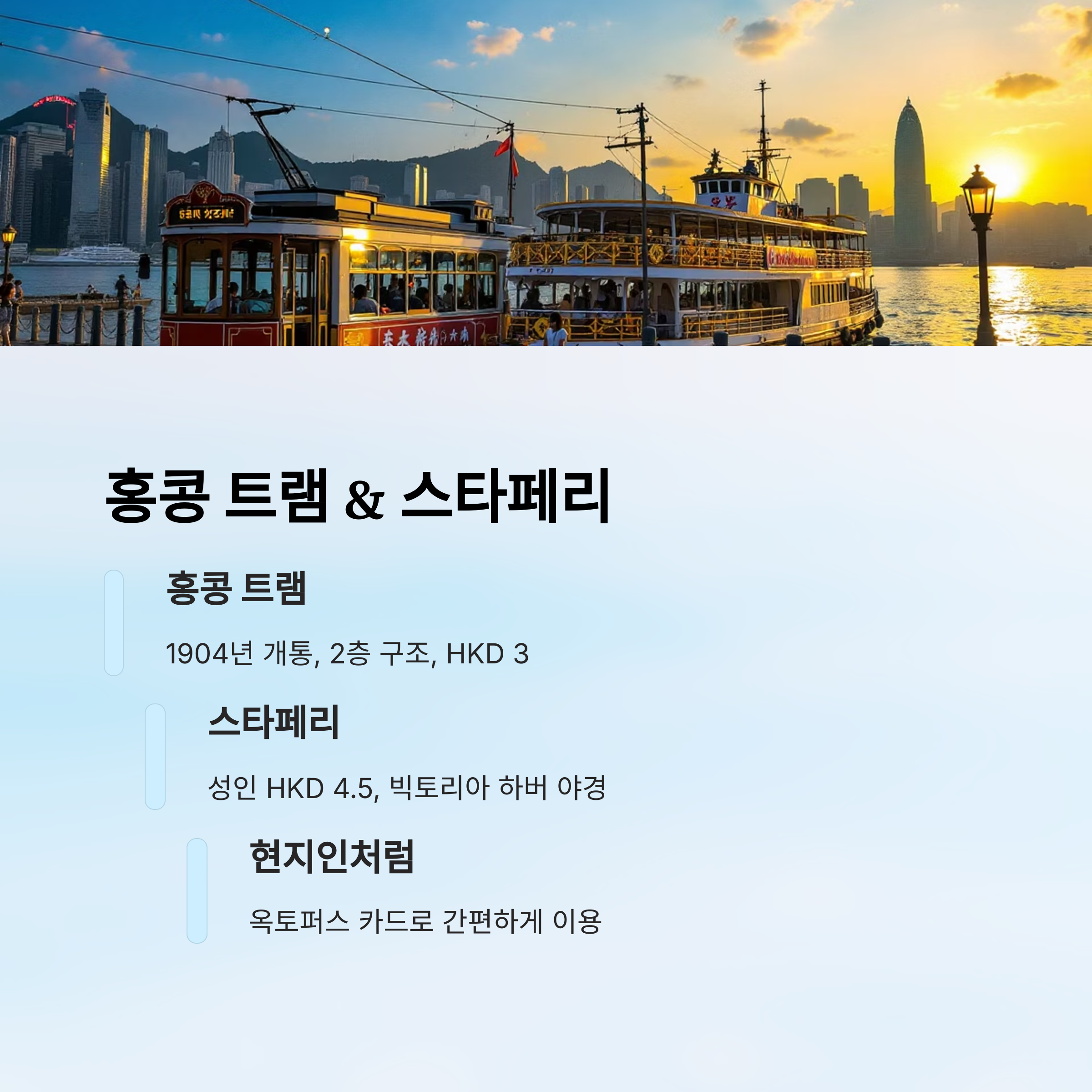 홍콩의 트램과 페리는 저렴하면서도 독특한 경험을 선사해요. 여행 중 가벼운 이동을 겸해 잠시 휴식하며 풍경을 감상해보세요. 🌆