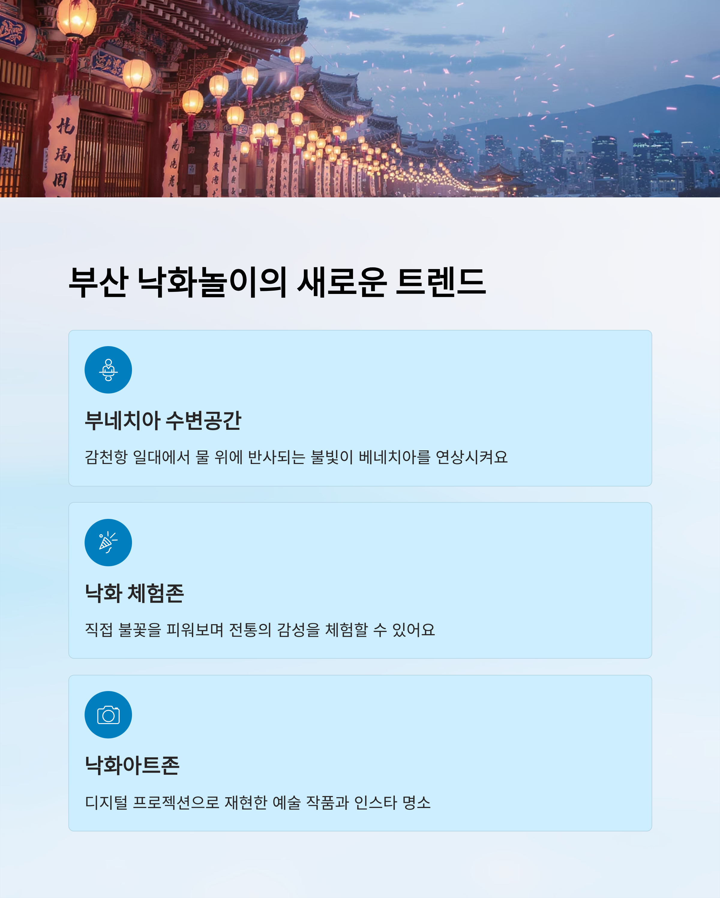 부산시는 2025년을 기점으로 ‘야경특화 관광벨트’ 프로젝트를 진행 중이에요. 낙화놀이는 그 중심에 있는 핵심 콘텐츠죠. 기존의 불꽃축제보다 더 가까이에서 체험할 수 있고, 낙화 체험존까지 마련되어 있어요. 방문객은 직접 불꽃을 피워보며 감성을 느낄 수 있답니다. 🔥