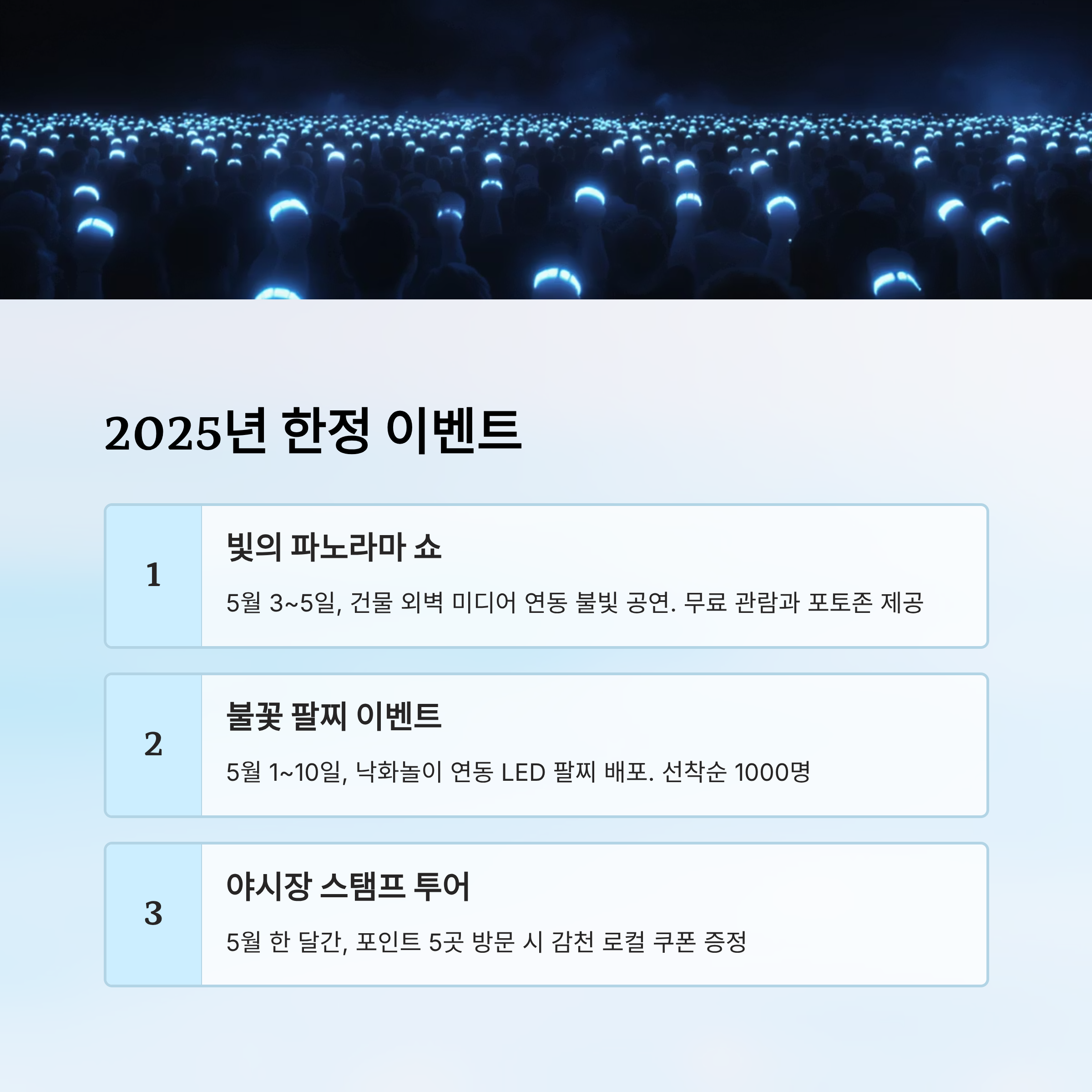 | 불꽃 팔찌 이벤트 | 5월 1~10일 | 낙화놀이 연동 LED 팔찌 배포 | 선착순 1000명 |