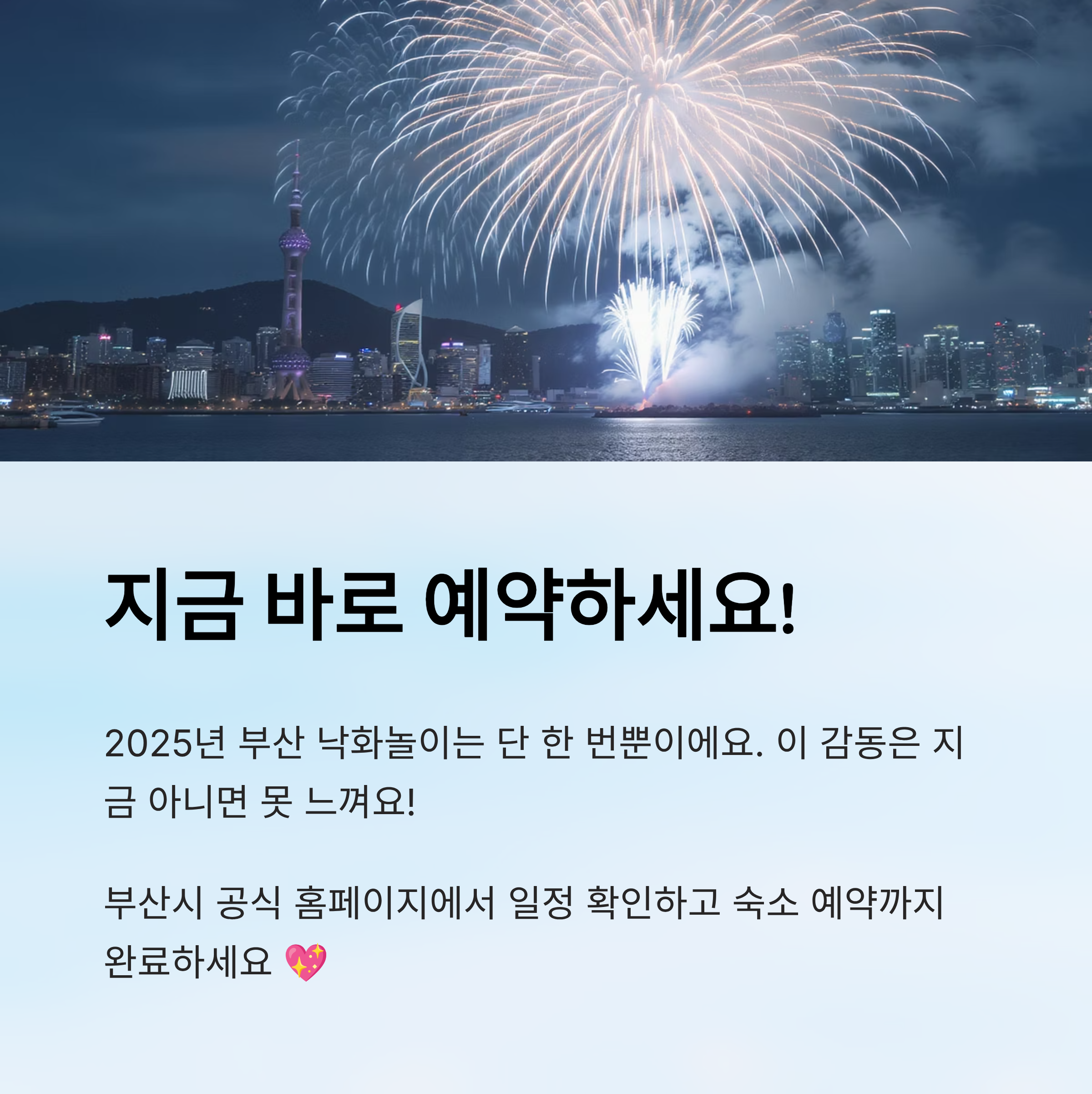 지금 바로 부산시 공식 홈페이지에서 일정표를 확인하고, 숙소 예약까지 마무리해보세요. 이번 낙화놀이는 단 한 번뿐이에요. 이 감동은 ‘지금’ 아니면 못 느낄 거예요. 💖