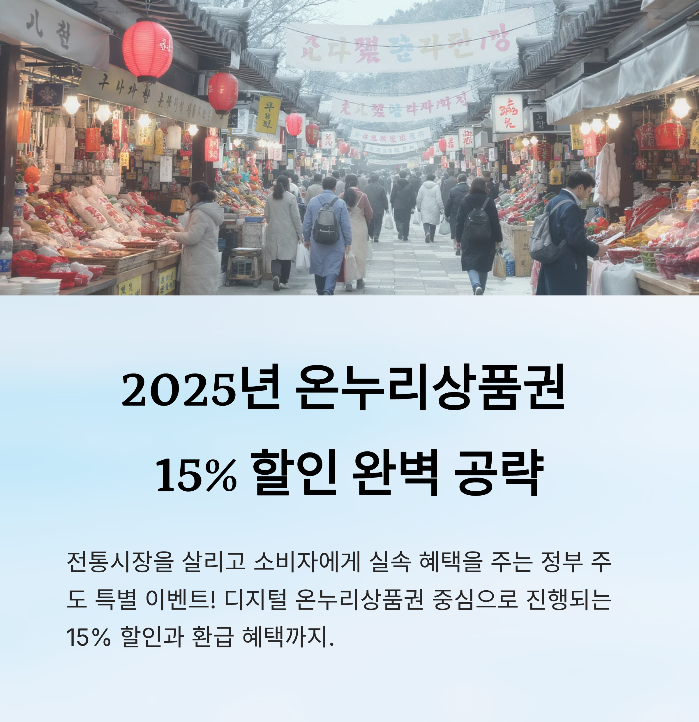 2025년에는 전통시장을 살리고 소비자에게 실속 있는 혜택을 주기 위한 15% 할인 온누리상품권 이벤트가 다시 열렸어요! 특히 디지털 온누리상품권을 중심으로 진행되며, 정부 주도의 설 명절 특별 할인과 더불어 환급까지 함께 진행돼서 참여자 입장에서는 두 배로 혜택을 받을 수 있었죠.
