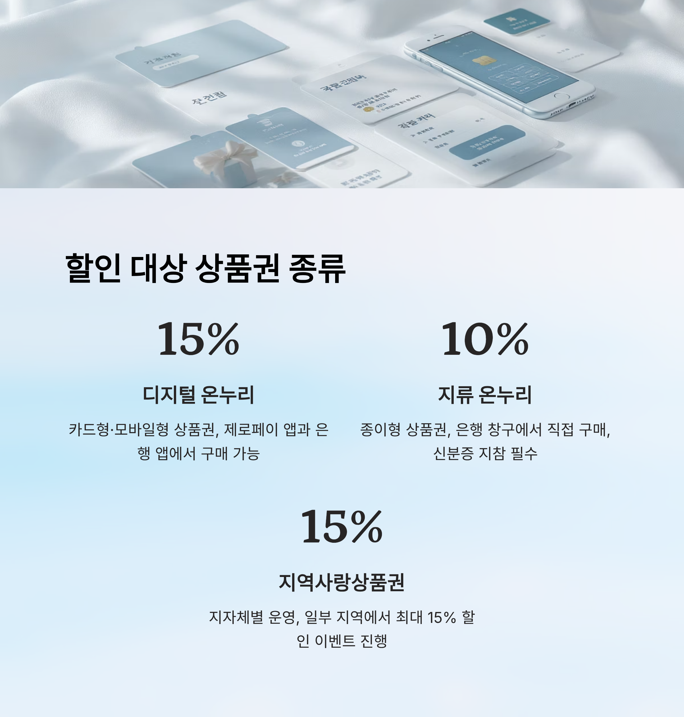 2025년 15% 할인 혜택은 모든 온누리상품권에 적용되는 게 아니에요. 주로 디지털 형태의 상품권, 즉 카드형과 모바일형에 집중돼 있었어요. 지류형은 일부 지역에서 10% 수준의 할인만 진행됐고요. 그래서 요즘은 대부분 사람들이 디지털 온누리상품권으로 몰리고 있답니다.