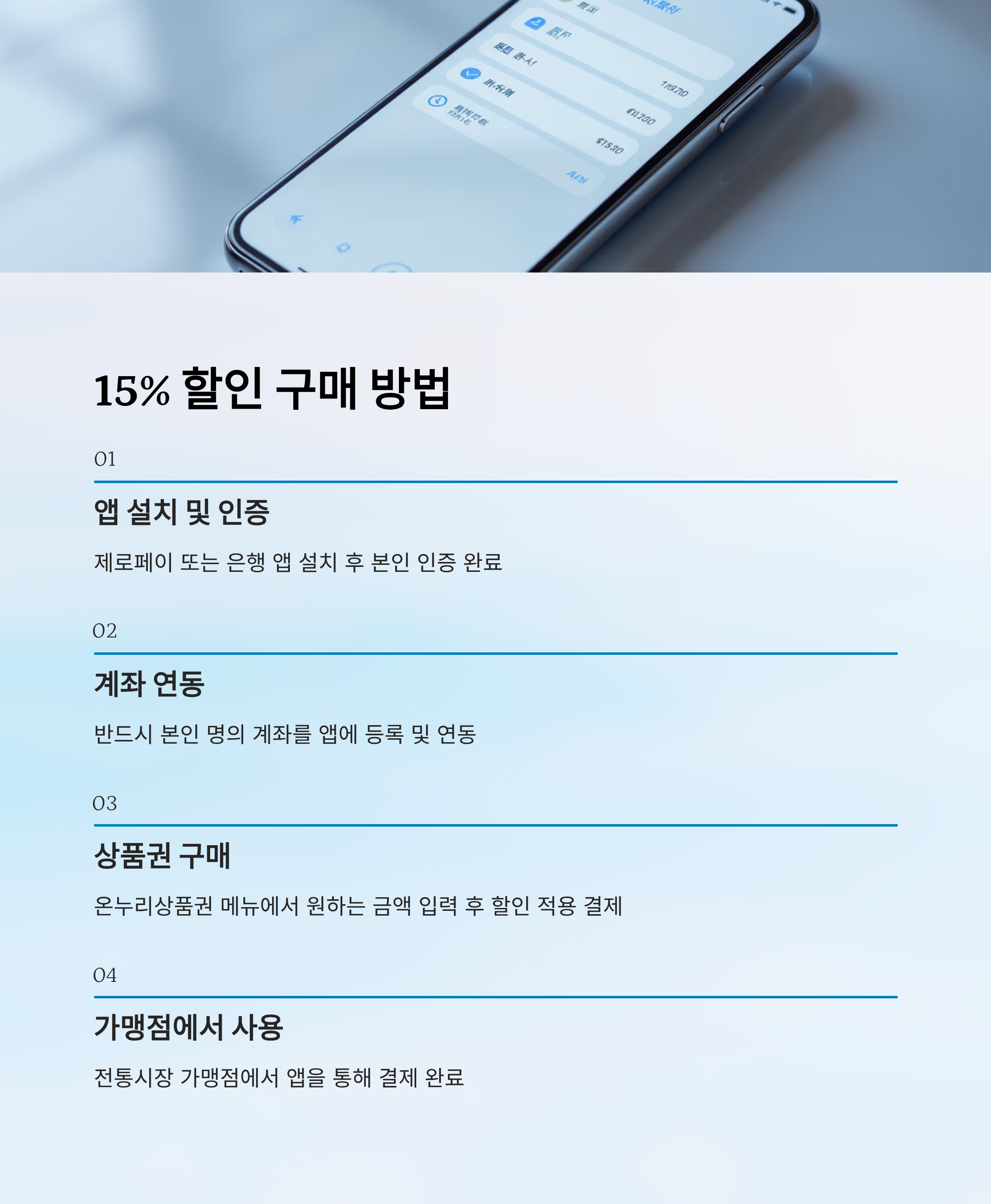 | 디지털 온누리 | 카드형/모바일 | 15% | 제로페이 앱, 은행 앱 구매 |