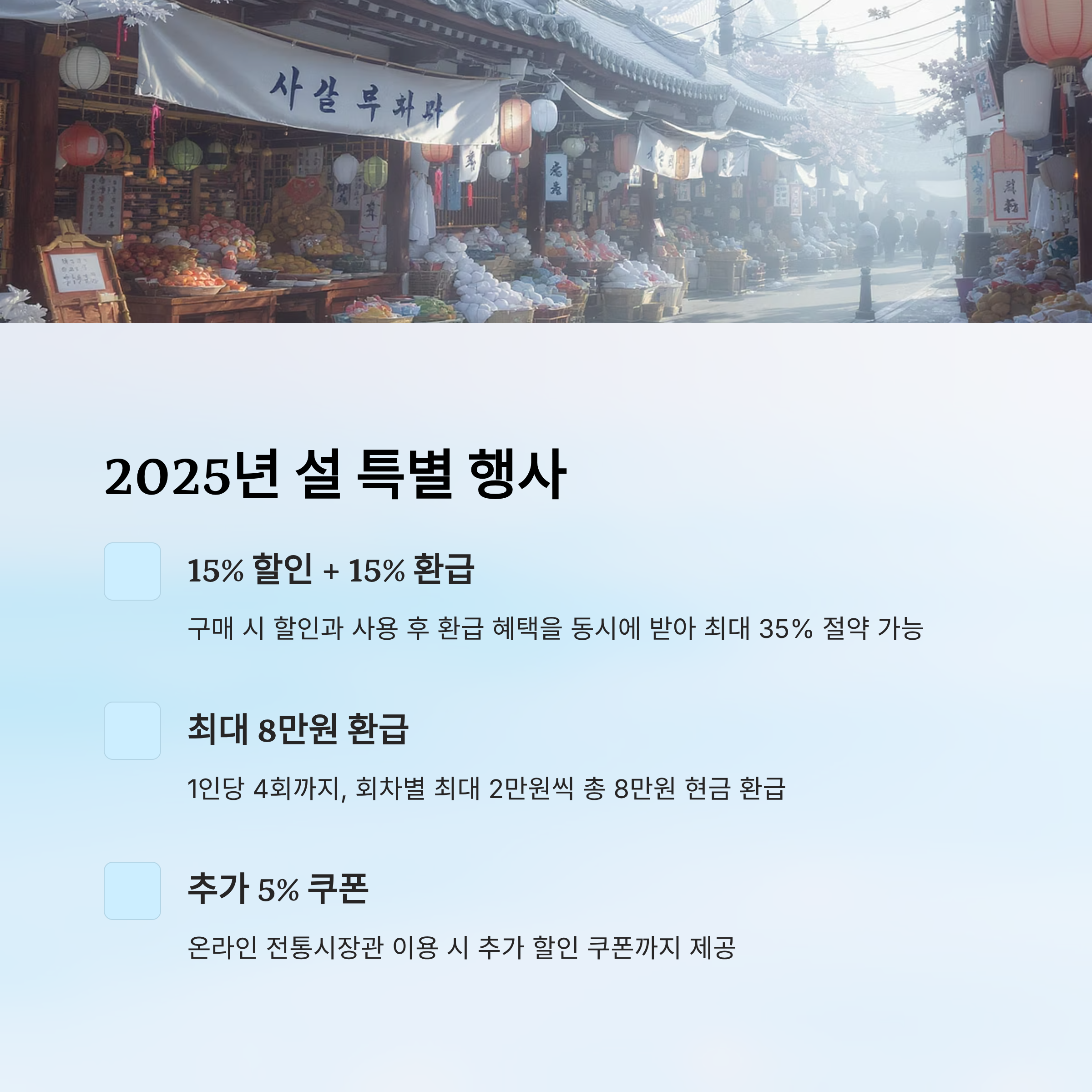 2025년 설 명절을 맞아 정부는 대규모 소비촉진 행사를 열었어요. 이 행사에서 가장 눈에 띈 건 디지털 온누리상품권 15% 할인과 함께 15% 환급 혜택이 동시에 적용된다는 점이었죠. 두 가지 혜택을 합치면 최대 35%까지 절약할 수 있는 구조였어요.