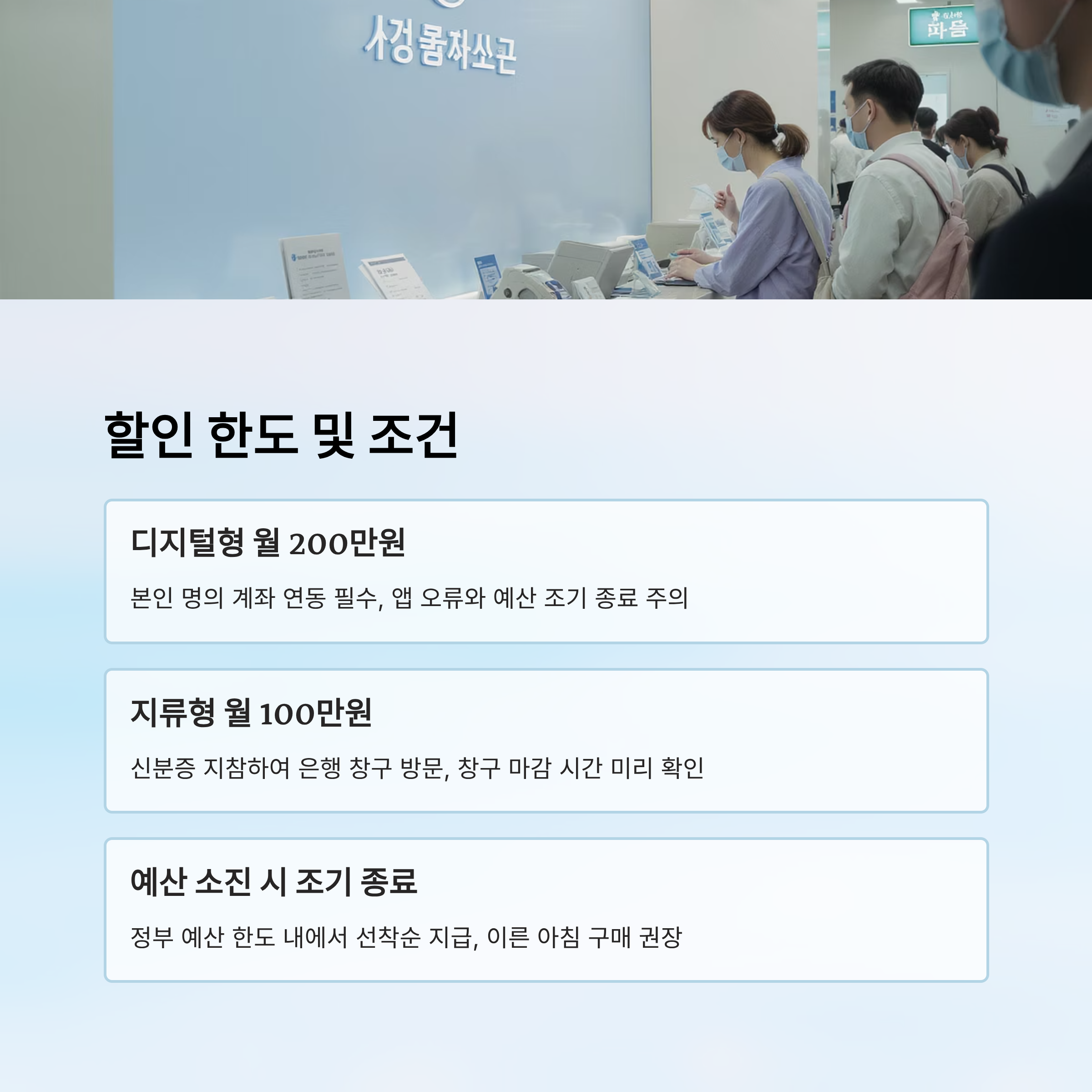 | 디지털형 | 월 200만 원 | 본인 명의 계좌 연동 | 앱 오류, 예산 조기 종료 주의 |