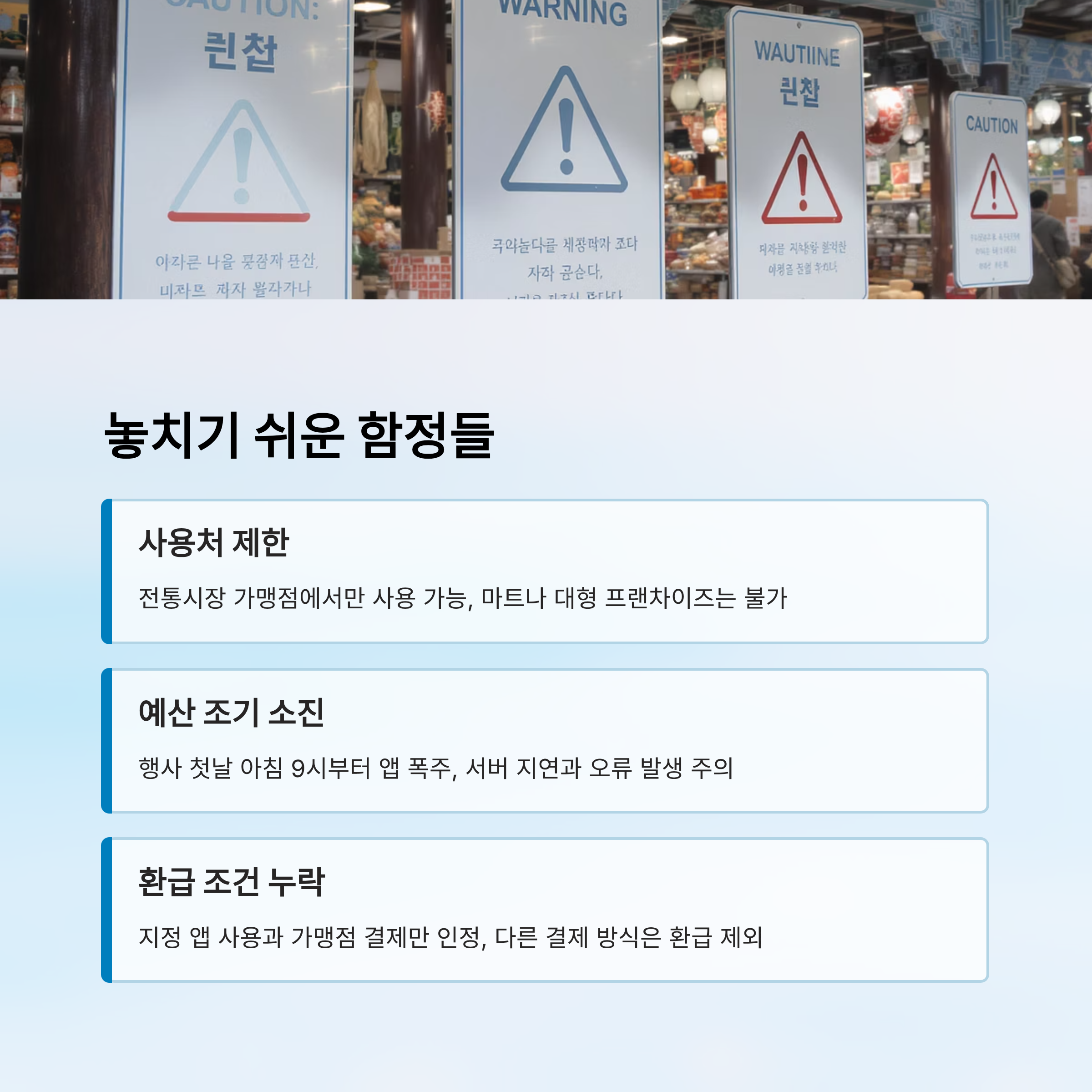 온누리상품권 15% 할인 이벤트는 정말 유용하지만, 몇 가지 함정을 모르고 지나치면 혜택을 제대로 못 받을 수도 있어요. 가장 흔한 실수는 ‘사용처 제한’을 모르고 구매하는 거예요. 모든 매장에서 사용할 수 있는 게 아니고, 전통시장 가맹점에서만 사용 가능하답니다.