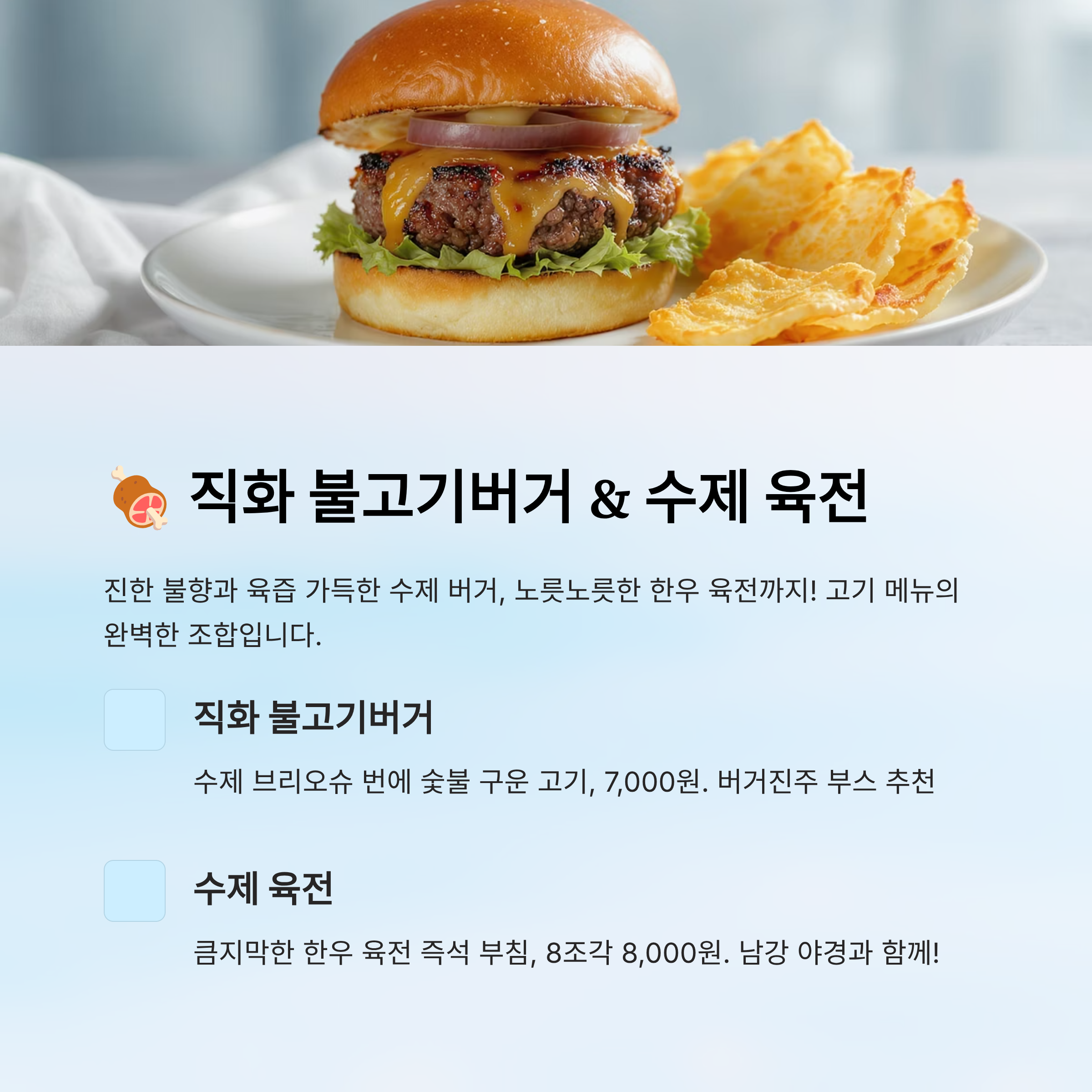 고기 메뉴는 대부분 남강 포토존 근처에 몰려 있어요. 이 구역은 야경이 너무 예뻐서 음식 사진도 더 맛있게 나오는 꿀 포인트랍니다. 📷
