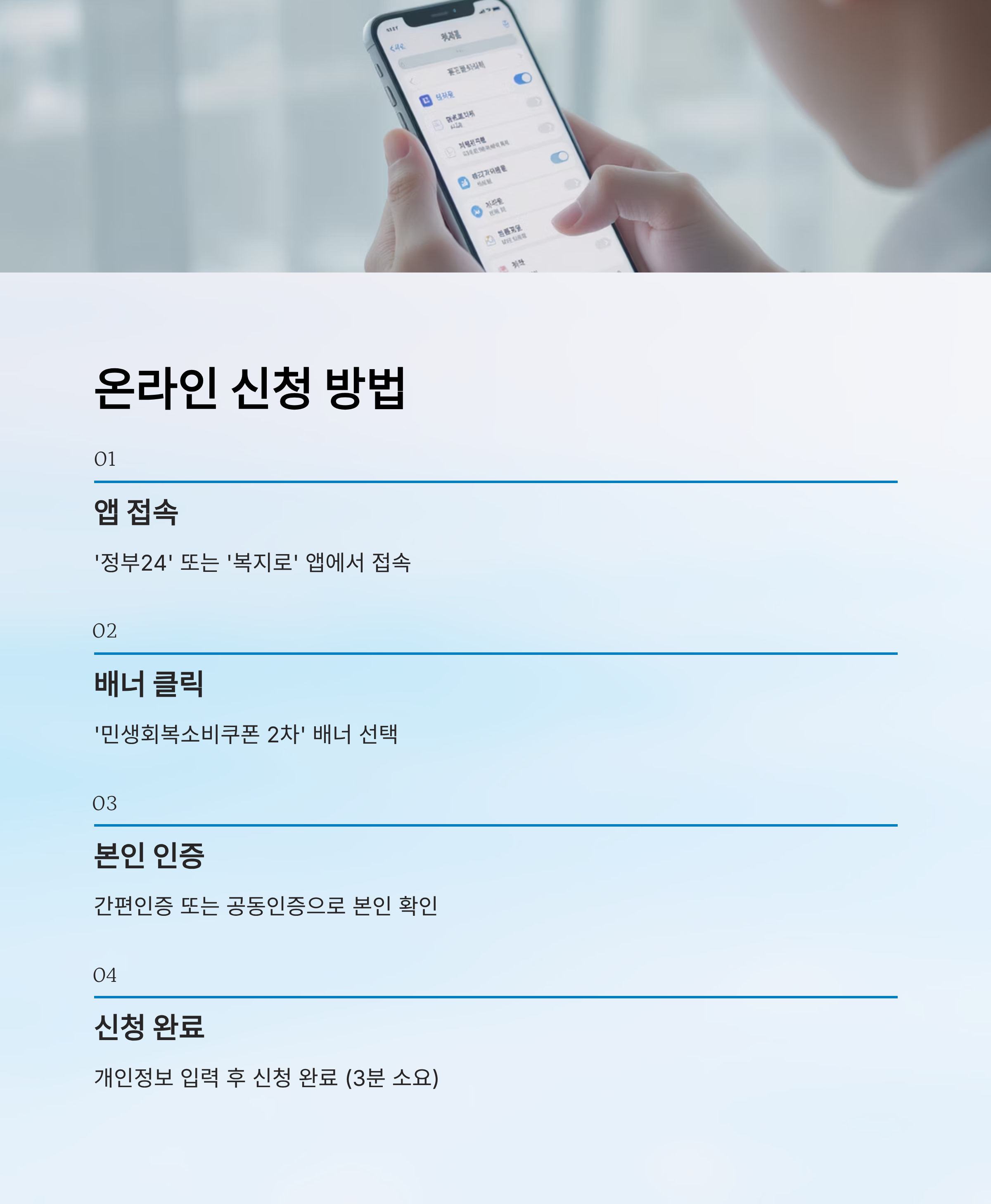 스마트폰을 사용하는 경우, '정부24' 또는 '복지로' 앱에서 본인 인증을 한 뒤 '민생회복소비쿠폰 2차' 배너를 클릭하면 신청 절차가 시작돼요. 총 소요 시간은 3분도 안 걸려요. 공인인증서 없이도 간편 인증만 있으면 끝!