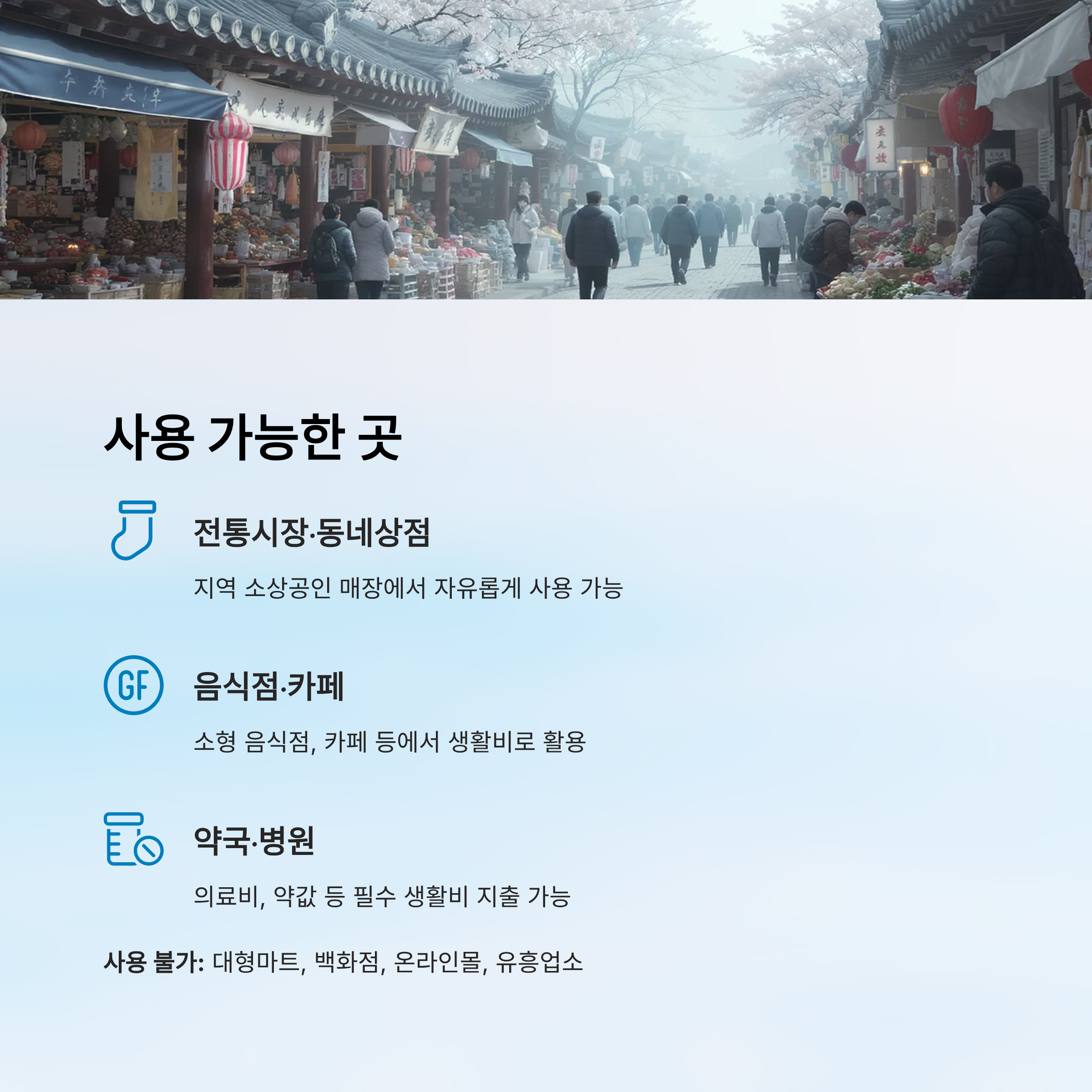 사용 가능한 업종이 다양해서 생활비로 충분히 활용 가능하다는 게 가장 큰 장점이에요. 특히 전통시장, 편의점, 소형 음식점 같은 곳에서는 대부분 쓸 수 있으니, 평소 자주 가는 매장에서 쓰기 딱 좋답니다 💡